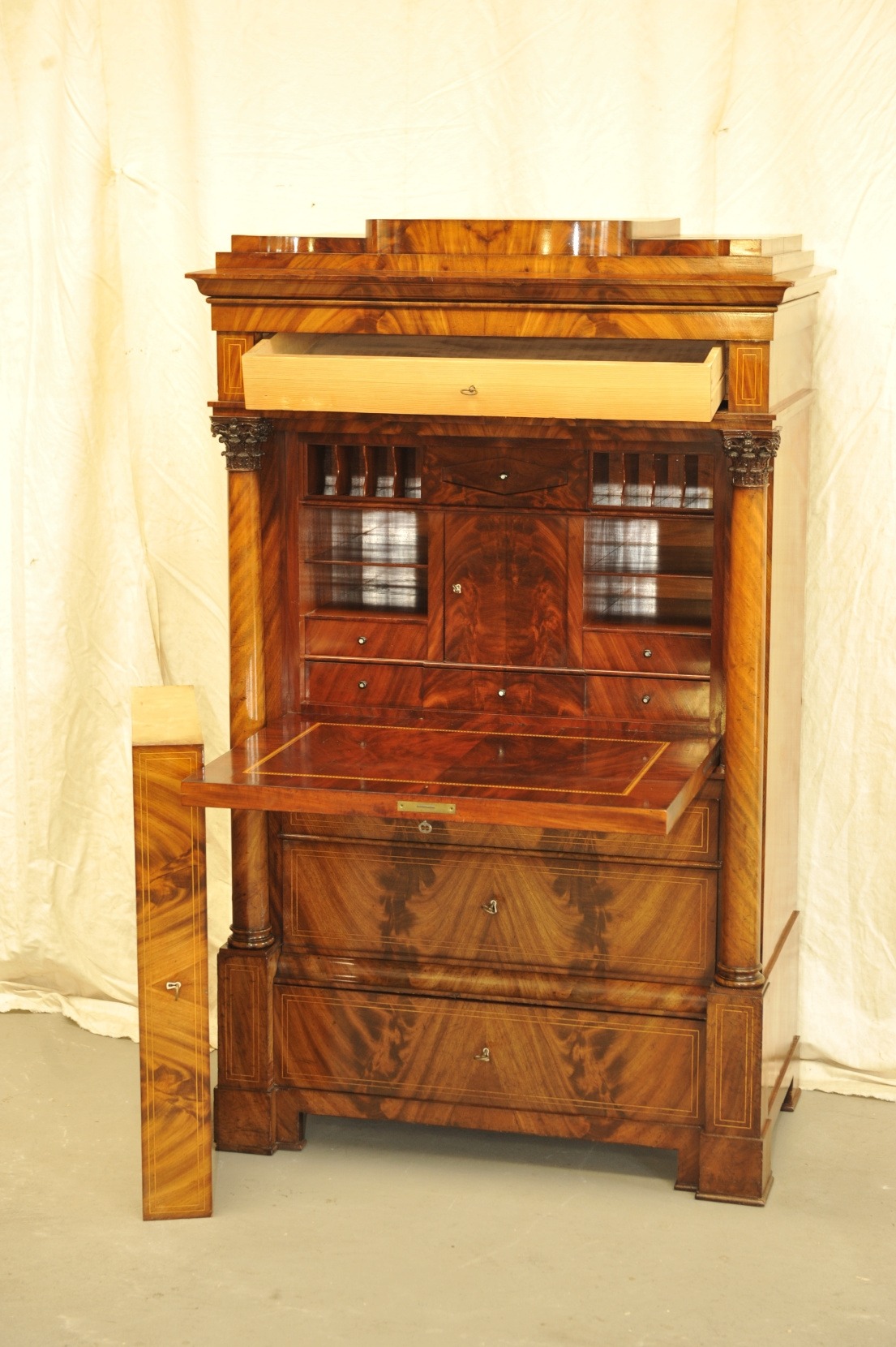 Die Bezeichnung 1A Schreibschrank Biedermeier Mahagoni verdient sich dieser Sekretär wegen seiner außergewöhnlichen Verarbeitungsqualität! Hier laufen auch noch nach zweihundert Jahren die Schubladen einwandfrei und ohne Hemmnisse. Bis auf kleinere Furnierergänzungen befindet sich der Sekretär im Originalzustand. Das tolle Furnierbild mit der Doppelfadeneinlage aus Ahorn,….. die imposanten flankierenden Säulen mit den Kompositkapitellen,…. die mit Geheimfächern und staubgeschützten Schubladenfächern ausgestattete Inneneinrichtung….das im getreppten Aufsatz verborgene und über die Kopfschublade erreichbare Geheimfach…. die Beschreibung dieses phantastischen Schreibschrankes würde Seiten füllen! Erworben in der Region, könnte es sich um ein Braunschweiger Hofmöbel von 1810 handeln, wurde aber zu dieser Zeit und in dieser Qualität und Art auch von Ebenisten aus Berlin und Sachsen ähnlich gearbeitet.