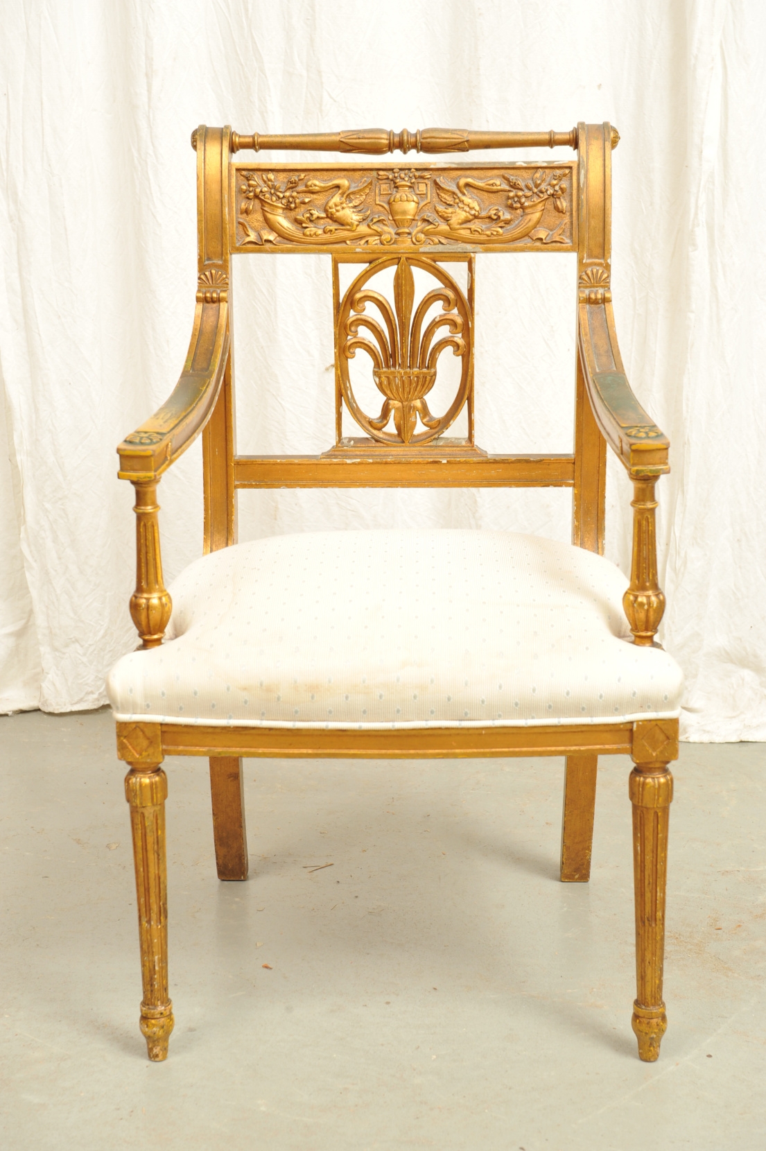 Sehr dekoratives Paar Armlehnstühle, reich geschnitzt und vergoldet aus der zweiten Hälfte des 19.Jahrhunderts. Die Schnitzmotive Amphoren, Vasen, Fächer, Schwäne und Füllhörner sind orientiert an den frühklassizistischen Motiven des Louis XVI Stils. Auch die geradlinige Architektur und die konischen Rundbeine mit Kannelierungen verweisen auf diese Epoche. Die Armlehnsessel haben ein festes Polster und besitzen einen guten Sitzkomfort, der Bezug des einen Sessels ist beschädigt/ verschlissen. Die kleineren Bestoßungen, die Schäden an der Vergoldung geben den Stühlen einen authenthischen Vintage-Charakter, sind quasi eine nostalgische Reminiszenz an Goldene Zeiten