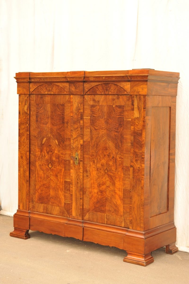 zerlegbarer antiker Dielenschrank, Nussbaum- und Nusswurzelfurnier auf Eiche, erbaut um 1790. Reduzierte Formgebung zugunsten einer flächigen Gestaltung durch ein herausragendes Furnierbild.Vertikale (drei) Gliederung durch (klassizistische) Pilaster.  Ein relativ schlichtes Sockelelement findet seine Entsprechnug in einem Kopfteil mit Arkadenbögen und „schlanker“ profilierter Kopffleiste. Allein schon der Verzicht auf Rahmen- und Füllungsbau bei den beiden Türen zugunsten der „Flächigkeit“  ist das „moderne“, die Biedermeierzeit ankündigende Element dieses bestimmt für einen herrschaftlichen Haushalt angefertigten Dielenschrankes.