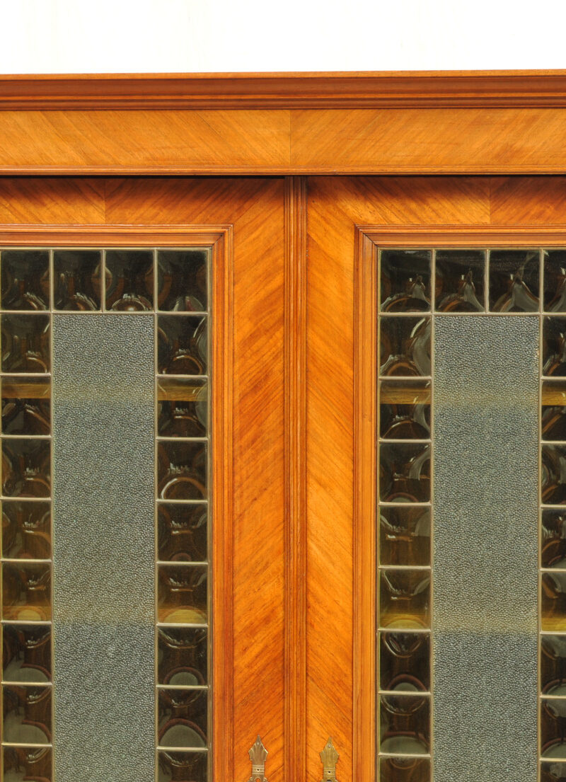 antiker Bücherschrank Nussbaum von 1890, der aufgrund seiner Verarbeitung und seines Erhaltungszustandes das Prädikat 1A verdient. Mit 193 cm Höhe gehört er zu den hohen Bücherschränken in dieser Epoche. Oberhalb der mit Reliefschnitzereien verzierten Sockelschublade geben zwei komplett aufschwingende Fenstertüren den Blick frei auf eine komfortable Inneneinrichtung mit Ablageboden und vier höhenvariabel verstellbaren Fachböden. Bei den Türen verwendete man zur Verschönerung bleigefasste Verglasungen. Das Bestreben des Historismus, Altes zu beleben, zu integrieren und mit Neuerem zu kombinieren ist hier sichtbar. Die Freude am dekorativen Schmuck, die Konzentration auf die schöne Schauseite: Reliefschnitzereien, profilierte Leisten, gründerzeitlicher Zierrat kombiniert mit den modernen im Blei verglasten farbigen Fenstern. Wenn Sie lieber Ihre Ausstellungsstücke sichtbar im Schrank ausstellen möchten, dann biete ich den kostenlosen Ersatz durch auch zeittypisches „antikes“ Fensterglas an.