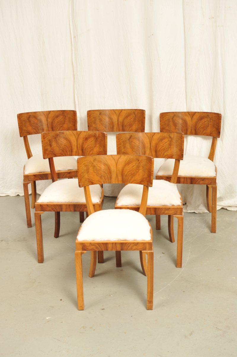 Angeboten wird ein Satz von 6 Art Deco Stühlen, die in Deutschland um 1930 erbaut wurden. Auffällig schön sind das ausgesuchte Nussbaumfurnier und die gebogten, ergonomisch geformten Rückenlehnen. Die Stühle befinden sich im sehr guten gebrauchten Zustand. Die Polsterung ( neue Federn und „Weißpolster“) wurde bei allen sechs Stühlen erneuert. Das heißt, dass ein sehr guter Sitzkomfort gewährleistet ist. Da die Polsterungen herausnehmbar sind, ist der Bezug mit einem schönen Stoff sehr einfach und auch machbar für einen Laien. Bei einer Sitzhöhe von 48 cm ( Polsterhöhe 52 cm) können auch größere Menschen gut auf dem Stuhl sitzen. Da die Stühle gut zu Biedermeiermöbeln passen, könnten sie die bequeme (und sehr preiswerte) Alternative am runden Biedermeiertisch sein.