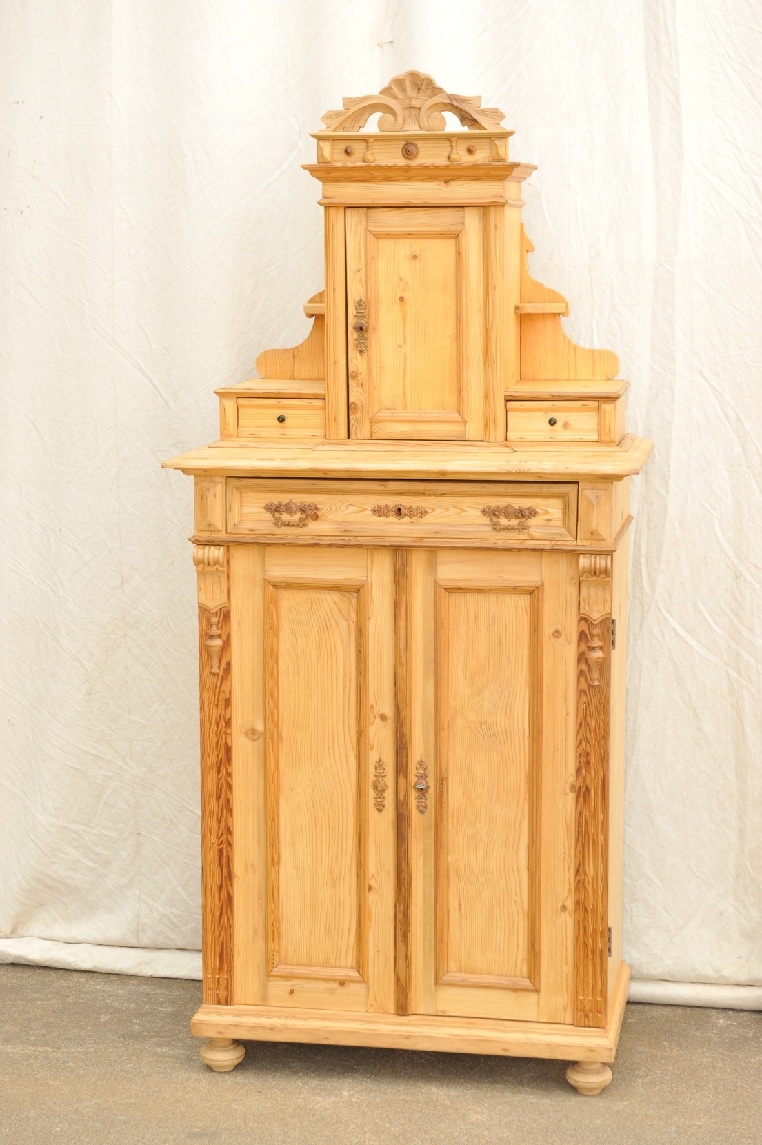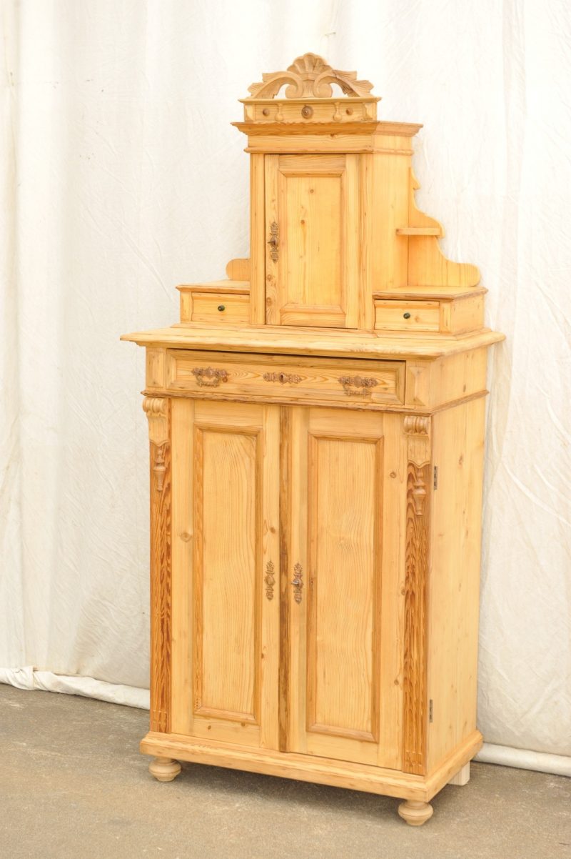 1 A Aufsatz Vertiko aus der Gründerzeit . Das um 1880/90 erbaute antike Weichholz Vertiko hat einen aufwändig gearbeiteten Aufsatz mit „Medizinschränkchen“ flankiert von zwei Schubladen. Und weil es ein klassisches Gründerzeit Möbel ist, hat es auch noch eine fein gearbeitete, geschnitzte Bekrönung. Die Türen des Unterschrankes schwingen komplett auf. Sehr guter Zustand.