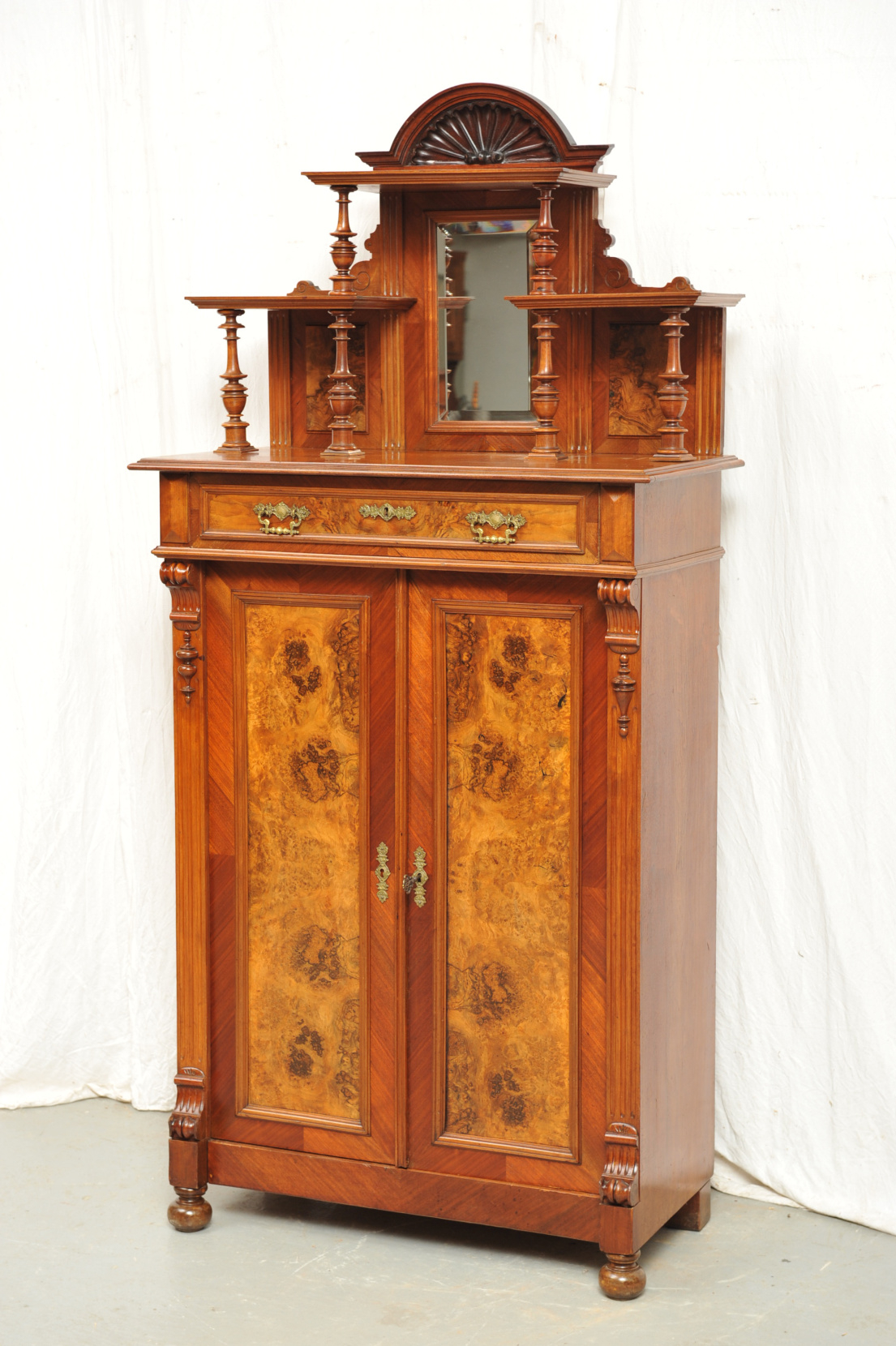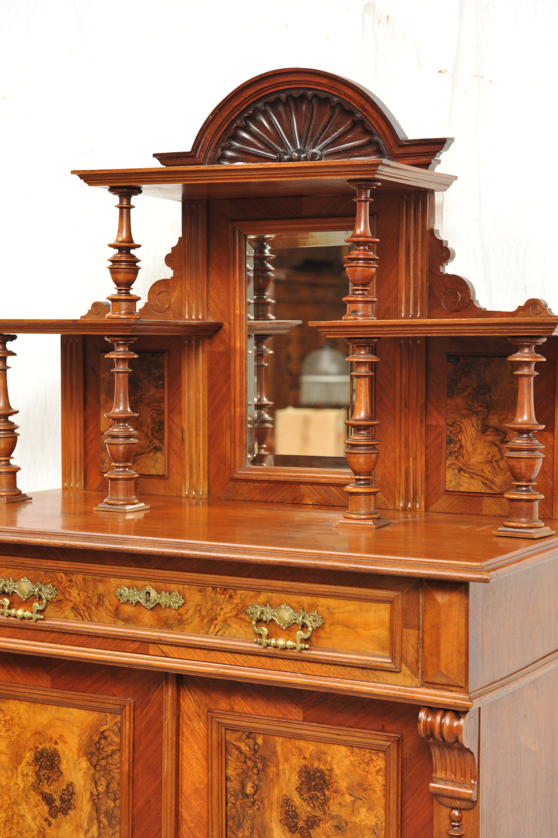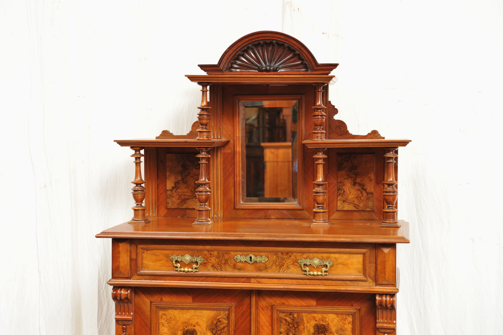 repräsentatives originales Aufsatzvertiko Gründerzeit Nussbaum von 1880/90. Das zweitürige Schrankelement steht auf runden Füßen und besitzt eine Kopfschublade, die Türfullungsbretter und die Schubladenfront wurden mit hellem kontrastreichen Nusswurzelfurnier belegt. Flankiert werden die Türen von kannelierten Pilastern mit geschneckten Basen und Kapitellen. Ein dreigeschossiger etagerenartiger Aufsatz mit Rückwand und mittigem Spiegel wird auf der unteren Ebene getragen von vier Balustersäulen und auf der zweiten Ebene von zwei Säulen. Die oberhalb der Rückwand aufgesteckte Aufsatzbekrönung mit muschelornamentiertem Segmentgiebel bildet den vertikalen Abschluß. Fazit:Ein prachtvolles Möbelstück aus der Gründerzeit mit muschelverziertem Segmentgiebel, Nusswurzelfurnier und etagerenartigem Aufsatz!