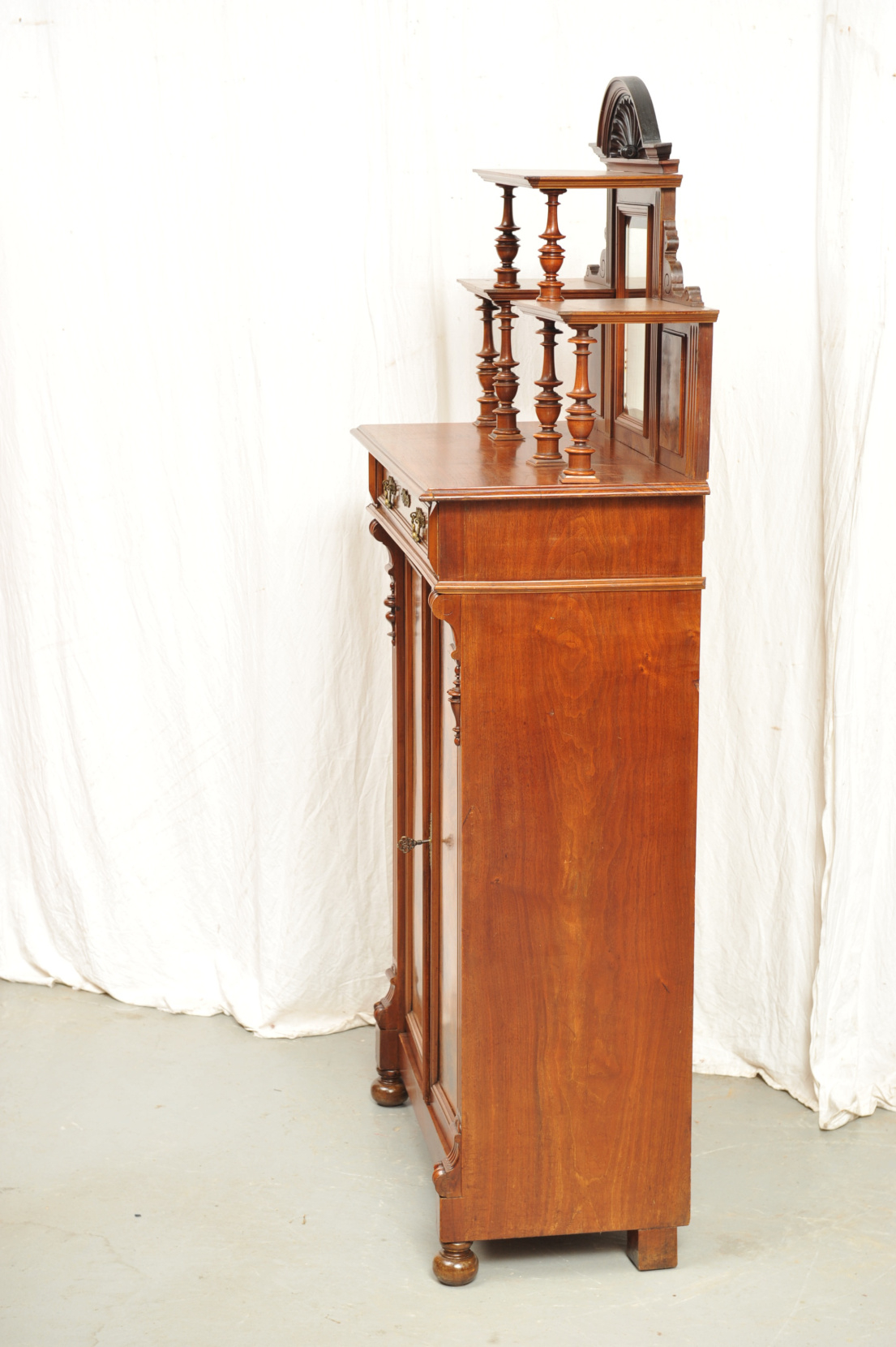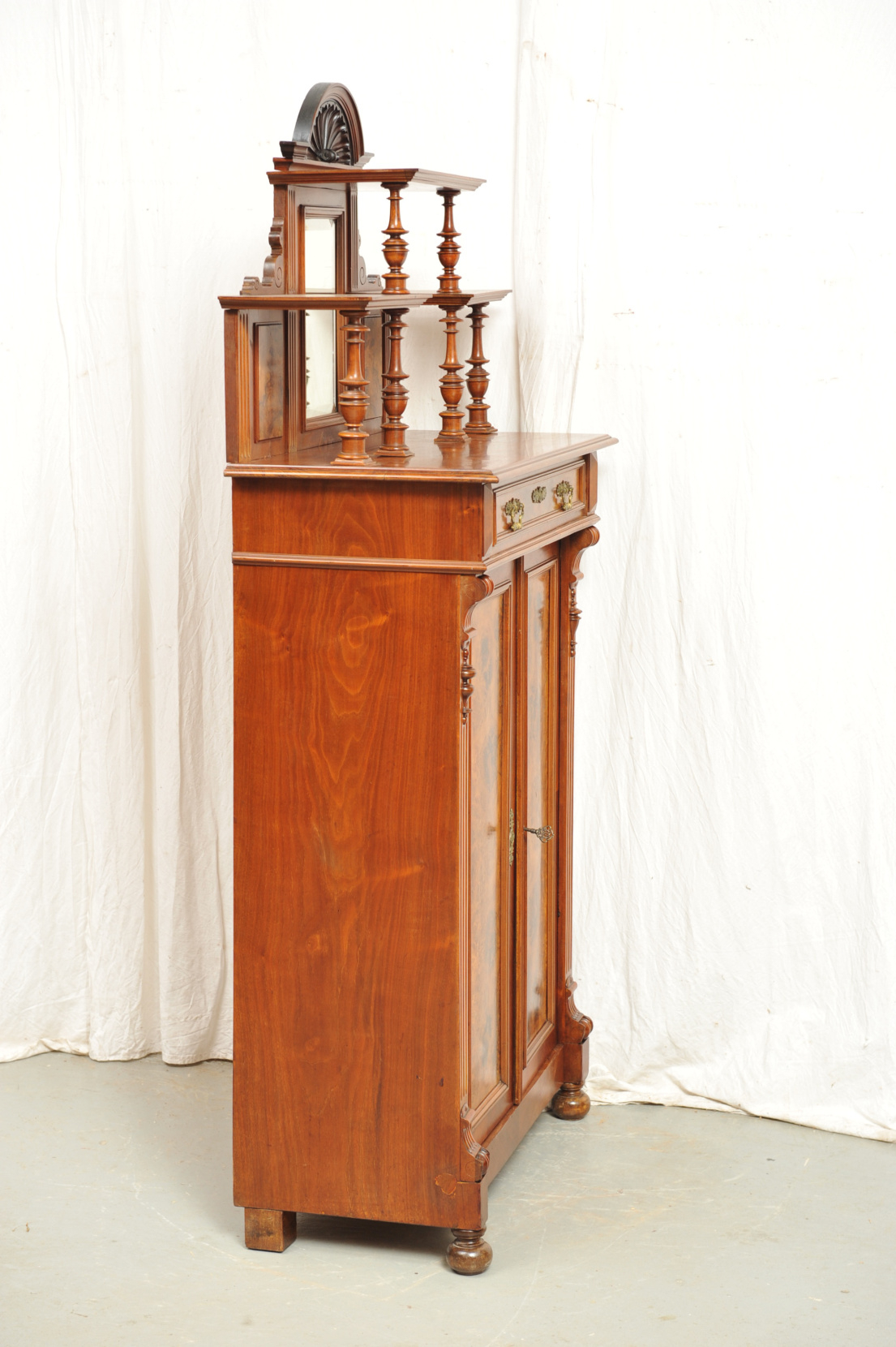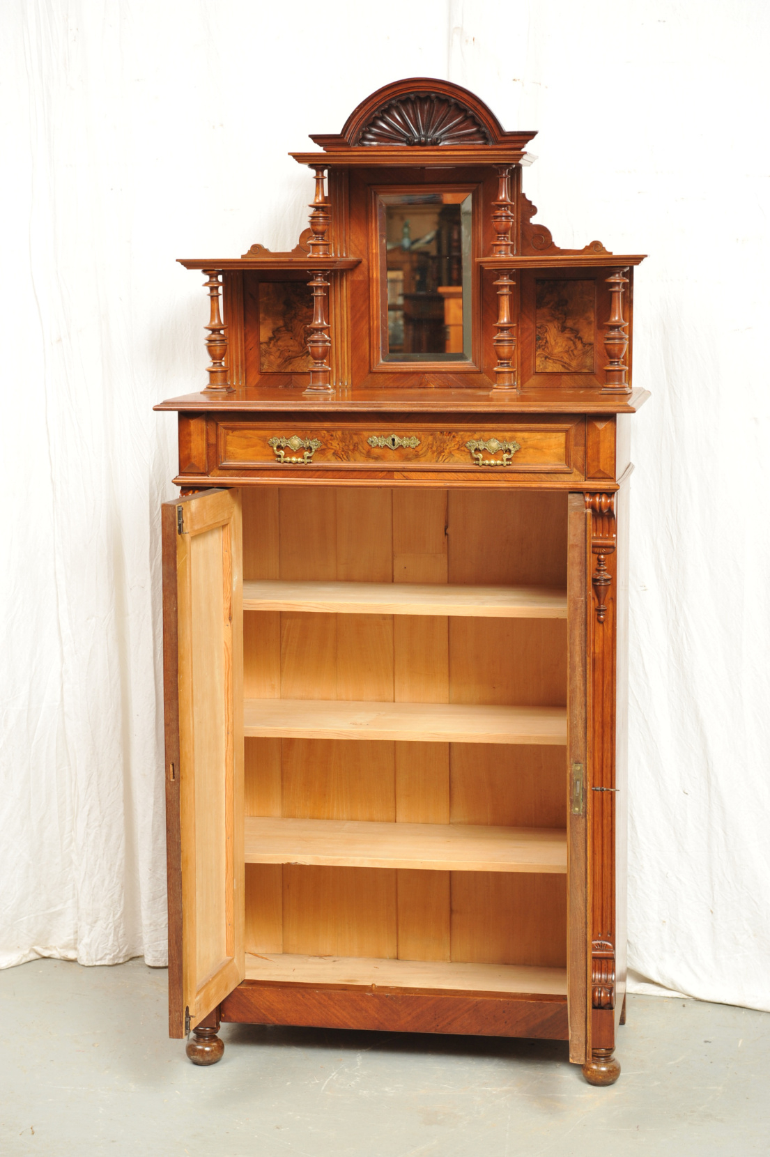 repräsentatives originales Aufsatzvertiko Gründerzeit Nussbaum von 1880/90. Das zweitürige Schrankelement steht auf runden Füßen und besitzt eine Kopfschublade, die Türfullungsbretter und die Schubladenfront wurden mit hellem kontrastreichen Nusswurzelfurnier belegt. Flankiert werden die Türen von kannelierten Pilastern mit geschneckten Basen und Kapitellen. Ein dreigeschossiger etagerenartiger Aufsatz mit Rückwand und mittigem Spiegel wird auf der unteren Ebene getragen von vier Balustersäulen und auf der zweiten Ebene von zwei Säulen. Die oberhalb der Rückwand aufgesteckte Aufsatzbekrönung mit muschelornamentiertem Segmentgiebel bildet den vertikalen Abschluß. Fazit:Ein prachtvolles Möbelstück aus der Gründerzeit mit muschelverziertem Segmentgiebel, Nusswurzelfurnier und etagerenartigem Aufsatz!