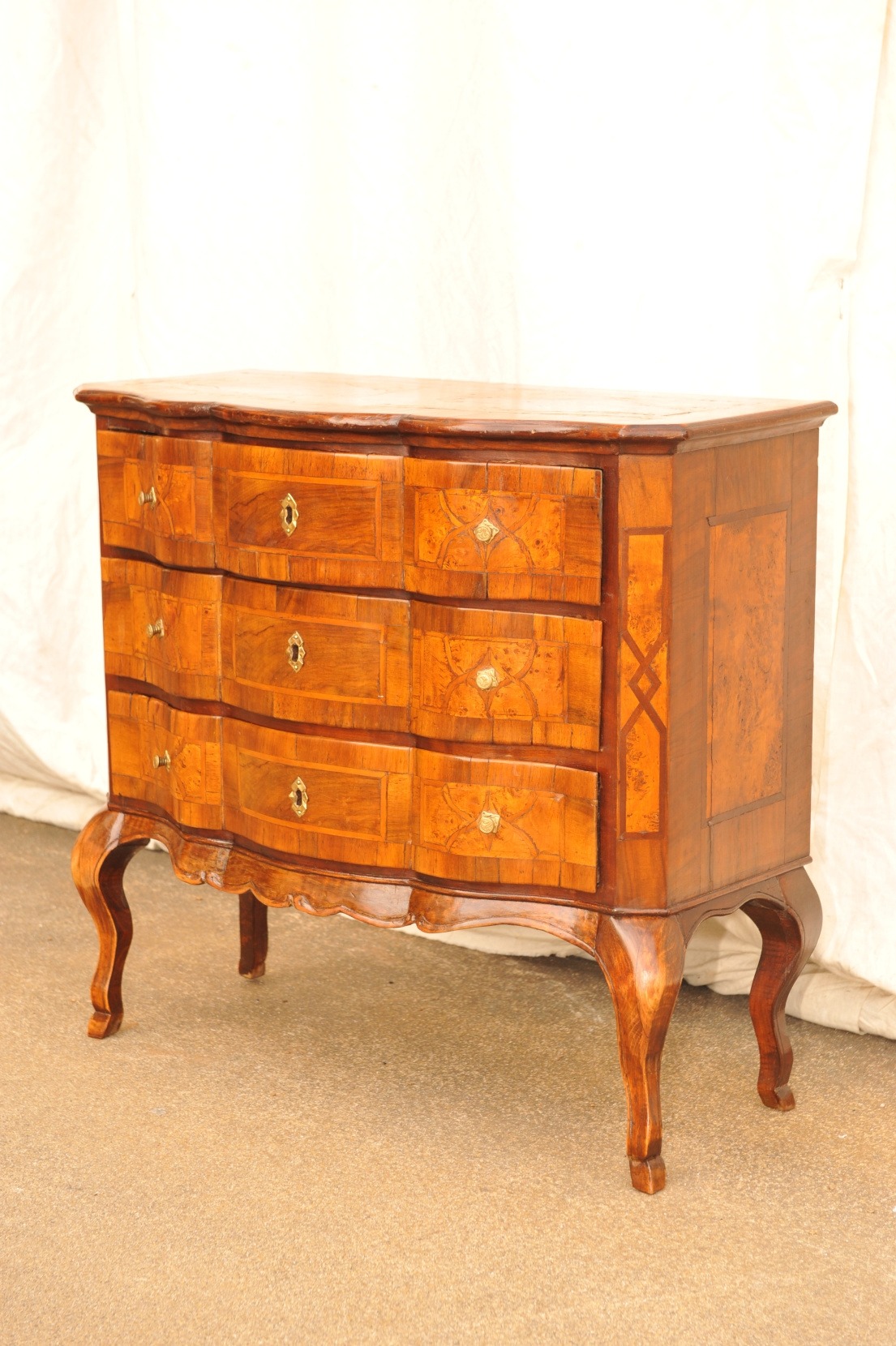 eine Barock Kommode Nussbaum furniert, dreischübig, mit gewölbt geschwungener Front, abgeschrägten Lisenen und geraden Flanken. Der Kommodenteil ruht auf vier über Eck gestellten , geschwungenen Beinen, die Zargen sind bewegt, profiliert und wellenmäßig. Der Sockel ist als Rahmenteil separat gearbeitet. Allseitige Marketerien: die Schubladenfronten architektonisch gefeldert mit Einlegearbeiten aus Zwetschge, Ahorn und Wurzelholz. Auf der Platte zweifach gerahmte Felder mit ovalen und C-bogenförmigen geometrischen Figuren, auf den Seiten Nusswurzel im inneren Feld, gerahmt von „Pflaumenband“ und einem breiten Nussbaum Fries. Ein zierliches, elegantes Möbel, welches noch gereinigt und mit einer Schellack Handpolierung „aufgefrischt“ wird. Schubladen waren innen tapeziert. Sockelteil und Größe deuten auf München um 1740/50 hin, die C-bogenförmigen Einlegearbeiten in Verbindung mit den geschweiften Formen könnten auch auf Mainz, bzw. Franken hindeuten. Preis so, ohne weitere Bearbeitung des Möbels : 2300 Euro