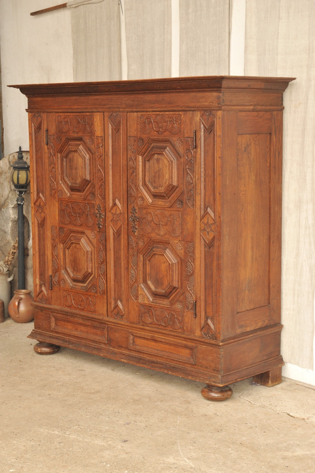 ein westfälischer Dielenschrank von 1750, zerlegbar, zweitürig mit zwei achteckig verleisteten Kissenfüllungen je Tür. Reiche und fein ausgeführte Schnitzarbeiten – Sonnenmotive, Blumenranken und Quasten- gestalten das Rahmenwerk. Ein Vorbesitzer gab an, dass dieser prachtvolle Schrank aus dem Besitz der Familie von Münchhausen stammen soll. In der Literatur ist er aber als Münsteraner Dielenschrank von 1750, baugleich und mit fast identischer Schnitzarbeit zu finden. ( vgl. Wolfgang Schwarze: Antike Deutsche Möbel, … von 1700-1840, Wuppertal 1975, S.76)