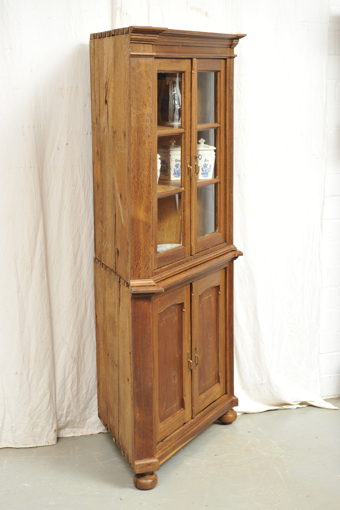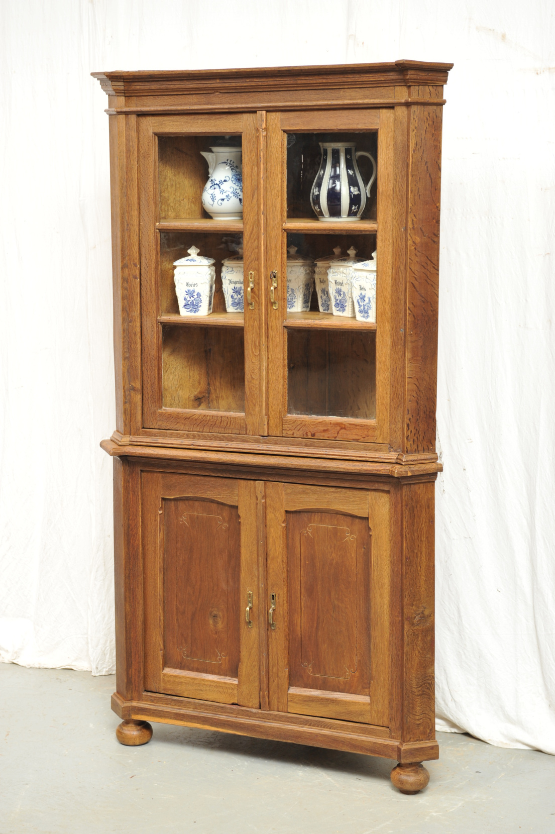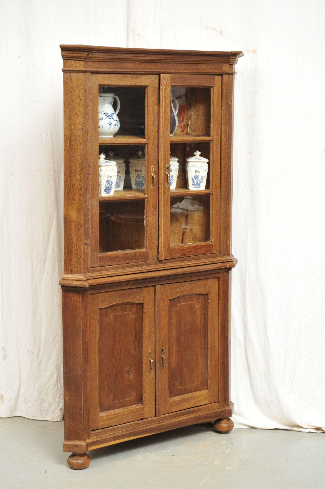 Biedermeier Eckvitrine Eiche lautet der Titel dieses zweigeschossigen Eckschrankes, norddeutsch um 1810. Aufgrund des massiven Eichenholzes und der Formgebung könnte der Schrank stilistisch auch in den Klassizismus fallen (der dem Biedermeier vorausging) oder ein ländlicher Bauernschrank sein, der traditionelle Formen länger beibehielt.Der formschöne wohlproportionierte Schrank mit den abgeschrägten Seitenkanten besitzt im Unterteil zwei Türen, erbaut in Rahmen- und Füllung Konstruktion und im Oberteil zwei frontverglaste Türen mit horizontaler Versprossung. Eckaufsatzvitrinen wurden in der Biedermeierzeit meist aus anderen, polierfähigen Hölzern erbaut, daher ist dies Exemplar selten in der Literatur und im Angebot des Handels zu finden…. und in diesem Falle unbedingt der Schar an eichenen Stilmöbel- Nachbauten aus dem zwanzigsten Jahrhundert vorzuziehen.