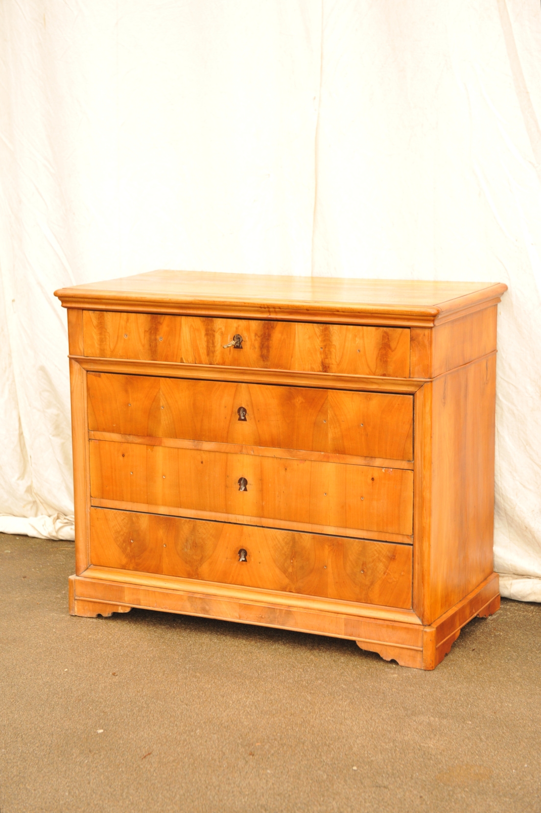 vierladige Biedermeier Kommode Kirsche , mitteldeutsch um 1840. Ein schönes spiegelbildlich angeordnetes Furnierbild der Front „wartet“ auf eine erneuerte Schellackpolierung um wieder „angefeuert“ in alter Schönheit zu glänzen. Preis „so“: 1100 Preis restauriert: 2100