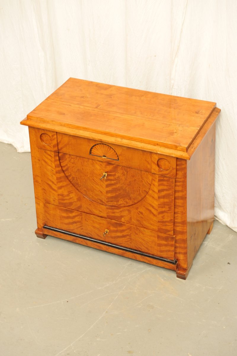 sehr seltene Biedermeier Kommode mit konischem Korpus, mitteldeutsch um 1815/20. Der Korpus erbaut aus massiver Birke, Die drei übereinander versetzt, aber ohne Traversen angeordneten Schubladen wurden furniert mit Birke Sägefurnier, der Einschub wurde durch Überlappung verdeckt. Das mittig gespiegelte „flächige Bild“ bezieht die Lisenen mit ein. Die obere Schublade mit dem vertieftem „sonnigen“ Bogensegment und den flankierenden kreisförmigen Vertiefungen ist durch den umgedrehten Segmentbogen gestalterisch verbunden mit der Schublade darunter. Basis der „Architektur“ ist das vorgezogene Sockelbrett mit der abgesetzt ebonisierten Leiste und das etwas breitere Frontbrett der untersten Schublade. Bis auf die hinteren Füße und die Schlüssel befindet sich die Kommode im originalen baulichen Zustand. Sammelwürdig