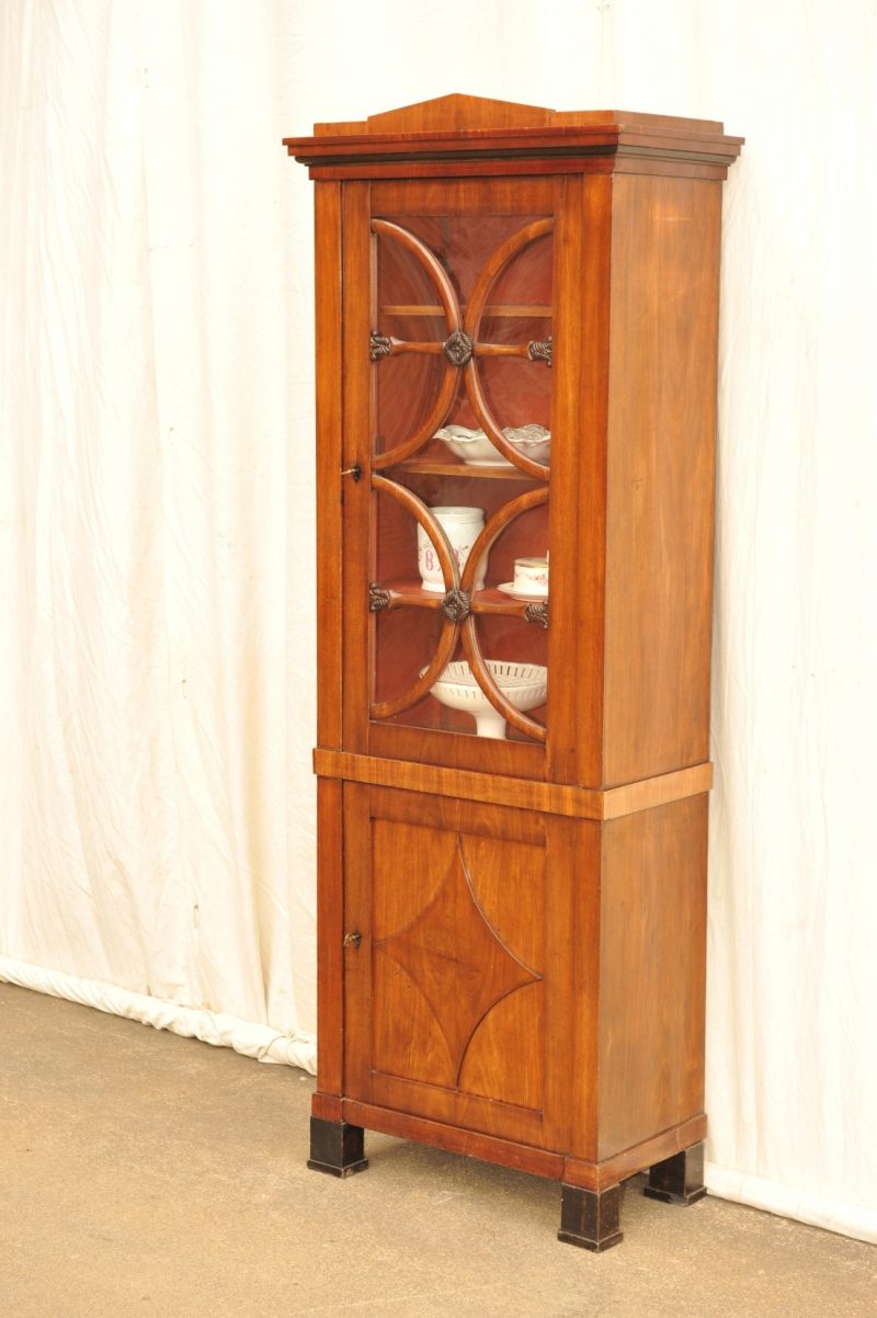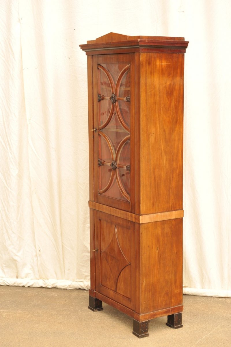 Pfeilerschrank mit Vitrine, Biedermeier Mahagoni, Hamburg um 1820, ungewöhnlich schlankes und hohes Format. Der zweigeschossige Pfeilerschrank hat eine Tür im Unterteil mit applizierter geschwungener Raute. Die obere verglaste Tür wurde gestaltet mit Quersprosssen und Halbkreisverstäbelung, die so angeordnet wurde, dass die Form der geschwungenen Raute wieder sichtbar wird. Im Zentrum der geschnitzten Rosetten erkennt man wieder eine Raute. Das mehrfach gestufte und damit markante Gesims wird von einem Spitzdach bekrönt. Der Biedermeier Vitrinenschrank befindet sich in einem hervorragendem Originalzustand. Die Oberfläche wird gereinigt und mit erneuerter Schellack Polierung „aufgefrischt“.