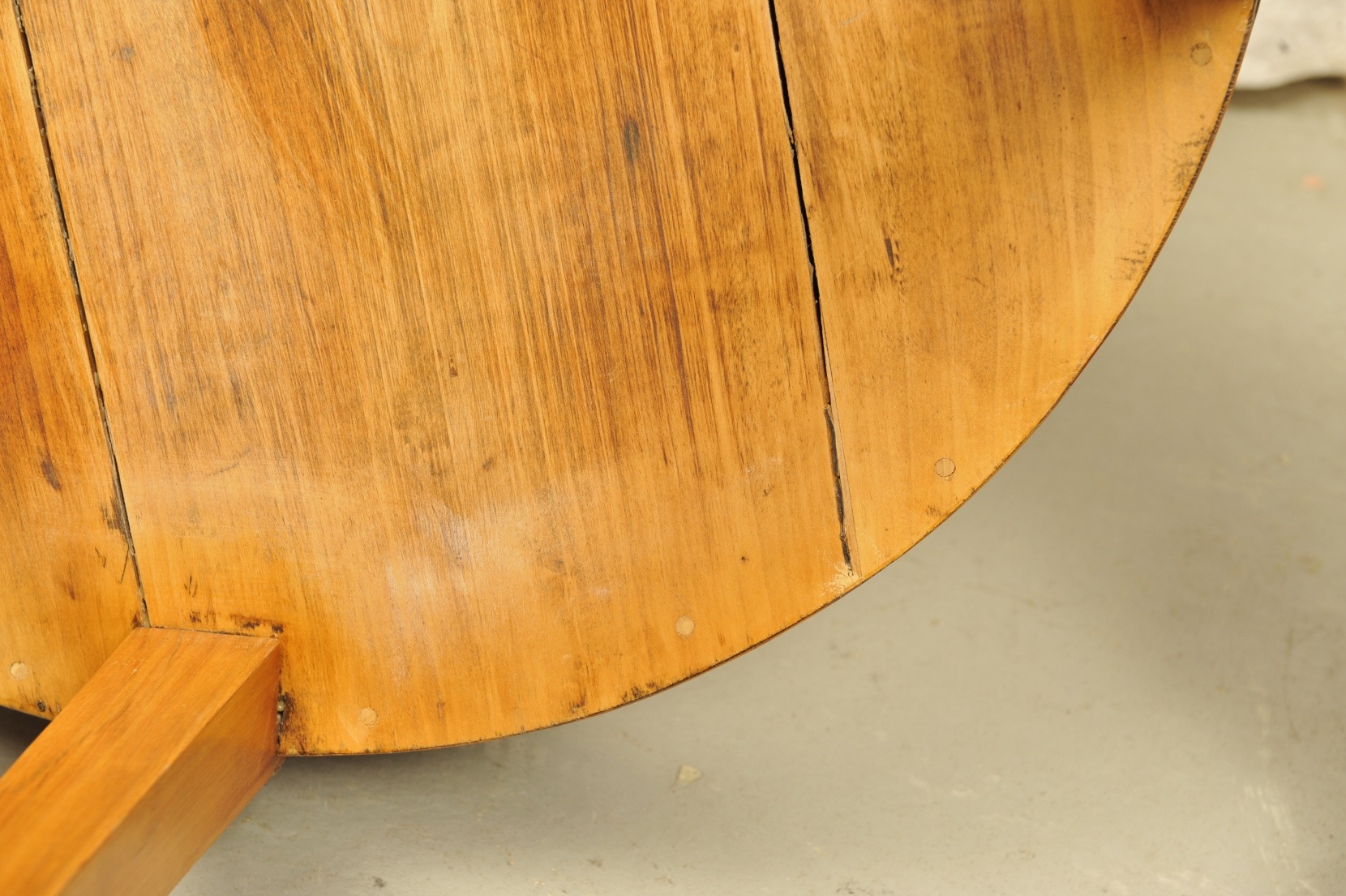 runder Salontisch mit reicher Marketeriedekoration mit Blumen-, Girlanden- und Musikinstrumentenmotiven , klassizistisches Biedermeier. Vier Spitzbeine in „Messingschuhen“ tragen den trommelförmigen Korpus mit Schublade , darüber die leicht vorkragende runde Platte mit durchbrochenem Messingrand. Nussbaum, Ahorn, Amaranth und auch gefärbte Furniere wurden verwandt. Eine Glasplatte zum Schutz der Platte bei intensiver Nutzung kann angefertigt werden.