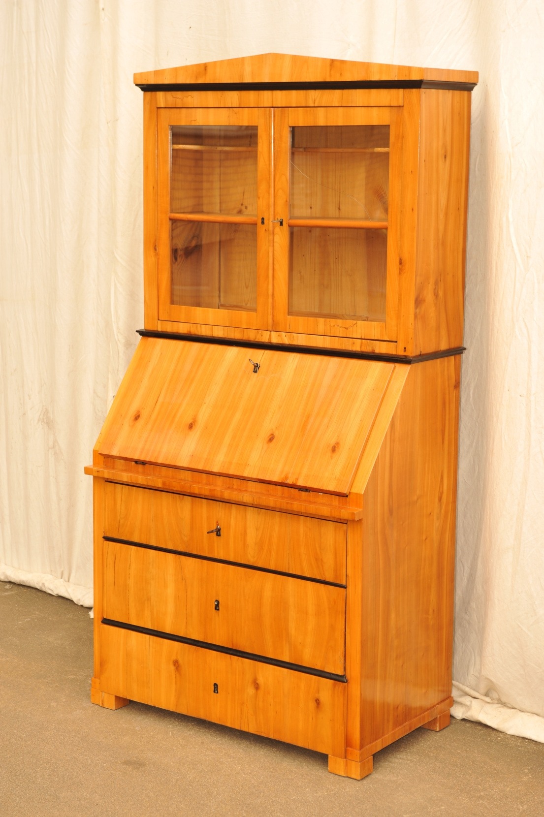 Biedermeier Sekretär mit Aufsatzvitrine. Das Kirschbaumfurnier ist flächig, spiegelbildlich und „strömend“ angeordnet. Die optische Gliederung erfolgt durch horizontal angeordnete ebonisierte Leisten und durch den ebonisierten Innenraum. Die beiden verglasten Rahmentüren des Oberteils sind je einfach versprosst. Siebenschübige ( optisch neunschübige ) Inneneinrichtung um ein rückseitig verspiegeltes Mittelfach.