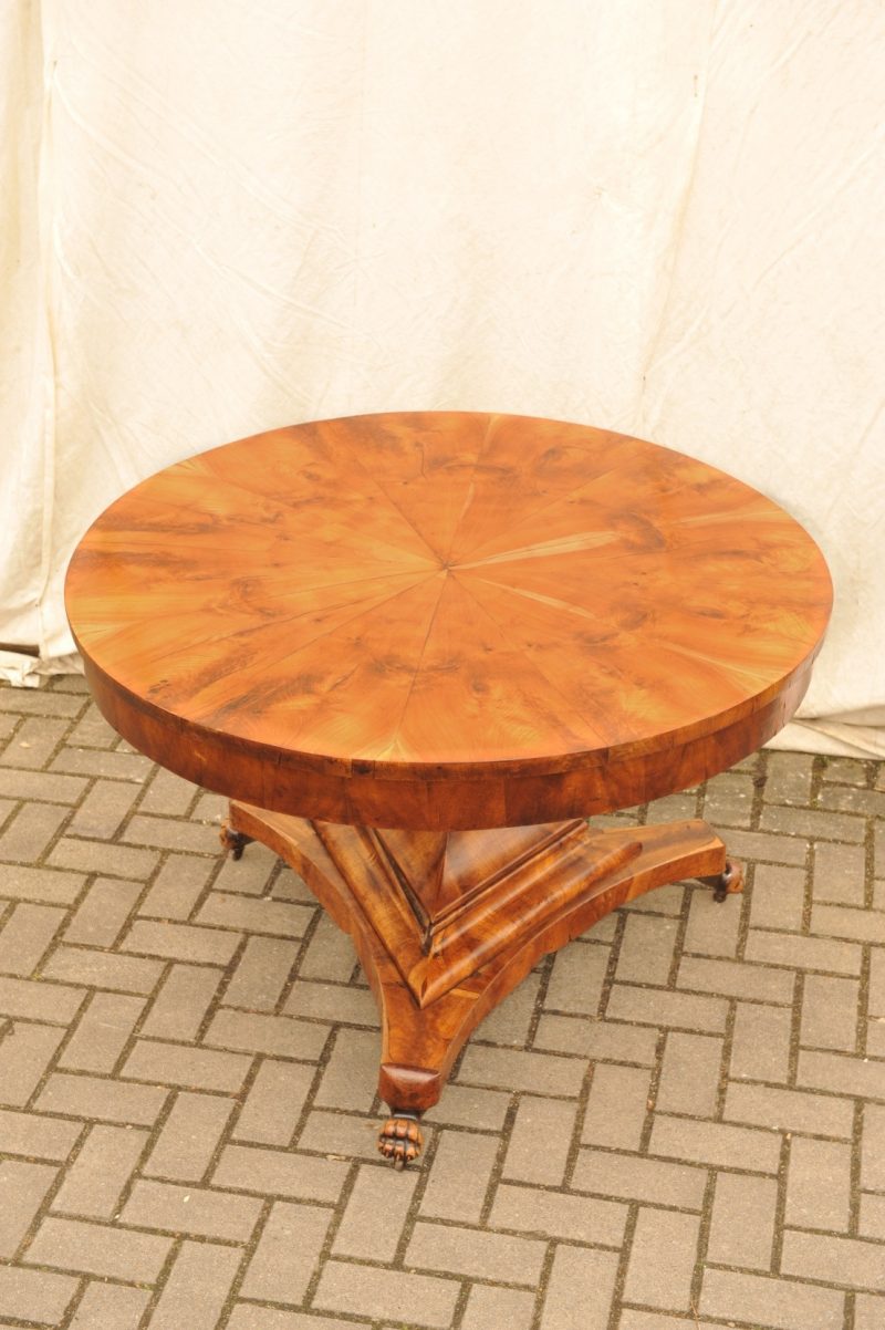 großer runder Biedermeier Tisch von 1820, Kirsche, mit aufrecht furniertem breiten Zargenreif und überkragender Platte, sternförmig furniert. Außergewöhnlicher exklusiver Unterbau: die getreppte dreipassig eingebogene Fußplatte mit Tatzenfüßen entwickelt sich nach oben als kühne dreispitzige Balustersäule. Teilrestaurierter Zustand, keine Furnierschäden, grundierte Oberfläche. Preis restauriert und handpoliert: 3800 Euro