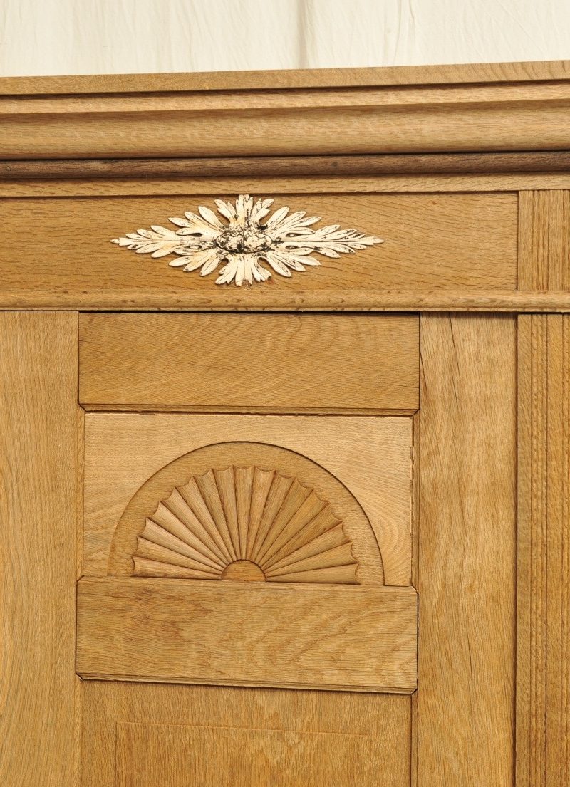 Dieser Sogenannte „Bremer Sonnenschrank“, Eiche, ist ein großer zerlegbarer (Kleider-) Schrank von 1810/20. Das Sockelgeschoss mit Blendschubladen mit Rhombenauflagen . Die Front wird vertikal dreifach gegliedert durch pilasterartige und fein kannelierte Brettauflagen. Die beiden Türen sind jeweils in zwei Felder eigeteilt, unten mit Kissenfüllungen, die oberen Felder mit fächerartigen Halbsonnen dekoriert. Das Kopfteil besitzt ein vorkragendes stark profiliertes Gesims. Die rautenförmigen Palmfächer sind aus Stuck und waren ursprünglich bemalt. Der Schrank befindet sich im teilrestaurierten Zustand. Der Farbton der Eiche und die Bemalung der Stuckelemente wird mit dem Interessenten abgestimmt. Voraussichtlicher „Endpreis“ als Kleiderschrank mit Ablage und Stange: 2900 Euro