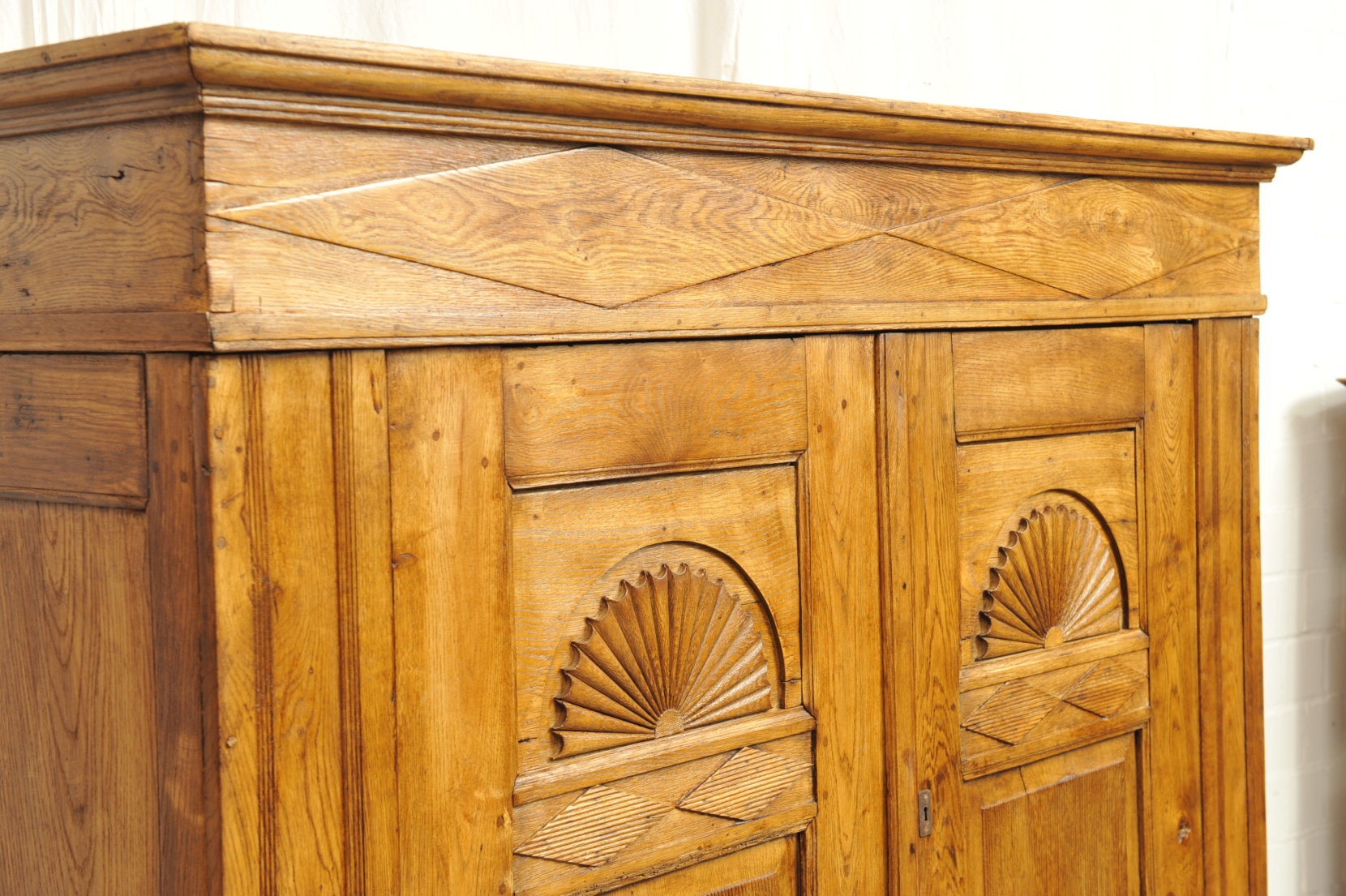 Dieser Bremer Sonnenschrank Eiche ist ein zerlegbarer Dielenschrank, Kleiderschrank, der um 1800/20 erbaut wurde. Das Sockelgeschoss und das Kopfteil wurden dekoriert mit Rautenauflagen und mit horizontal angeordneten profilierten Leisten gegliedert. Die beiden Türen sind in zwei Felder eingeteilt, unten mit Kissenfüllungen und feinem Rillendekor, die oberen Füllungen mit fächerartigen Halbsonnen dekoriert. Die flankierenden Lisenenbretter wurden ebenfalls mit feinen Rillen verziert. Im Preis enthalten ist ein Ablagebrett und eine Kleiderstange. Der Schrank ist mit zwei Personen einfach aufzubauen. Das einfache Stecksystem (ohne eine Schraube) funktioniert auch noch nach zweihundert Jahren, alles passt!