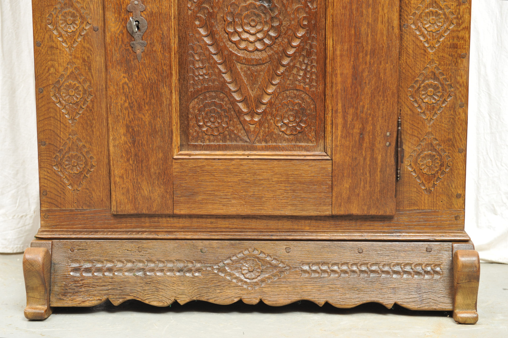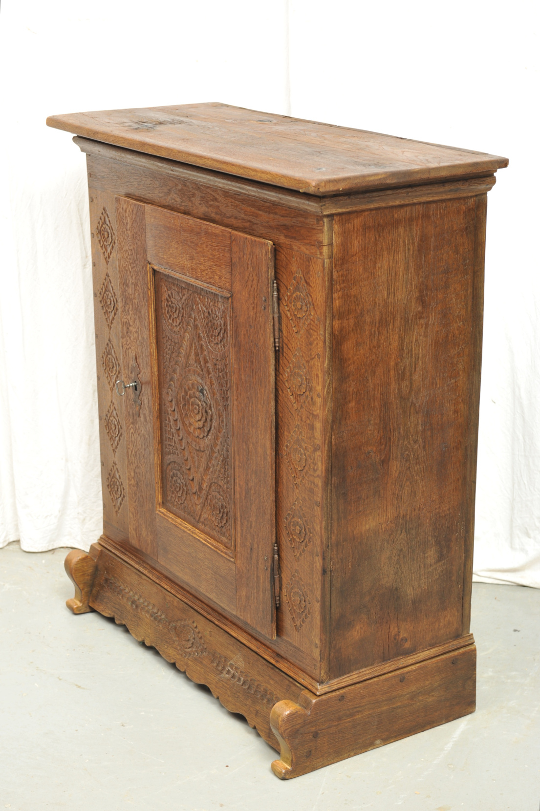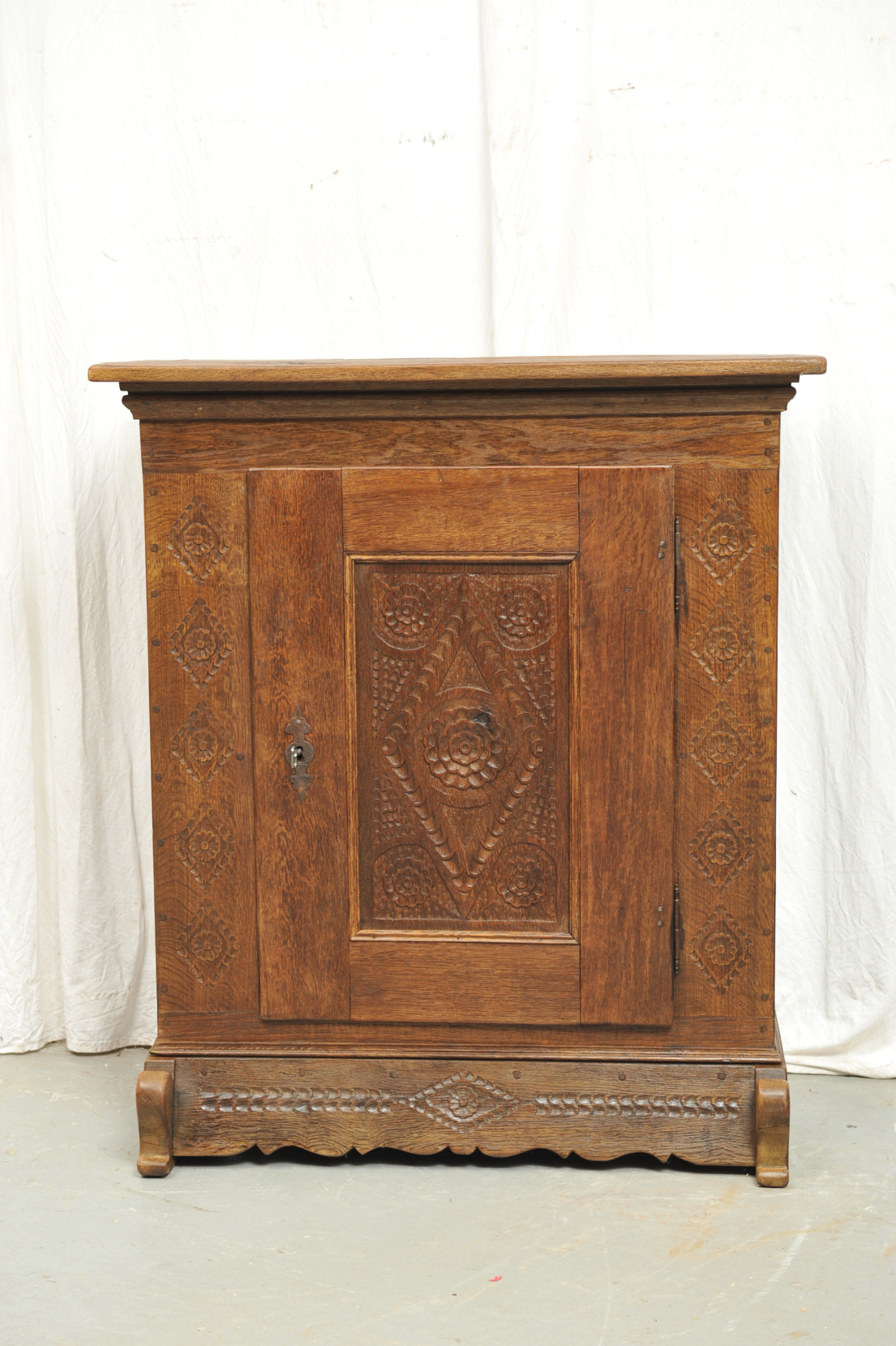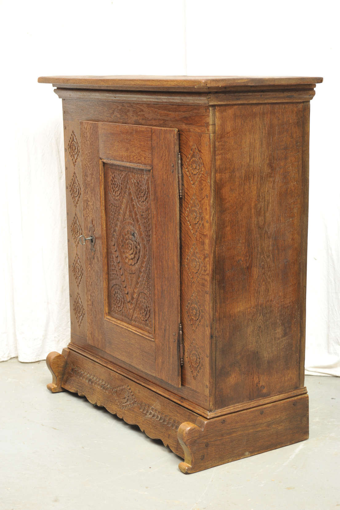 Brotschrank Eiche antik aus der Region Osnabrück, eintürig, auf Kufen stehend mit reicher Schnitzarbeit: Schuppen in Rosetten- und Rautenform auf den Lisenen , den Rahmen und der Türfüllung zieren die Front. Dunkle rustikale Eiche, kompakt und schwer und mit einem gesuchten Format: B 103 H 118 T 50