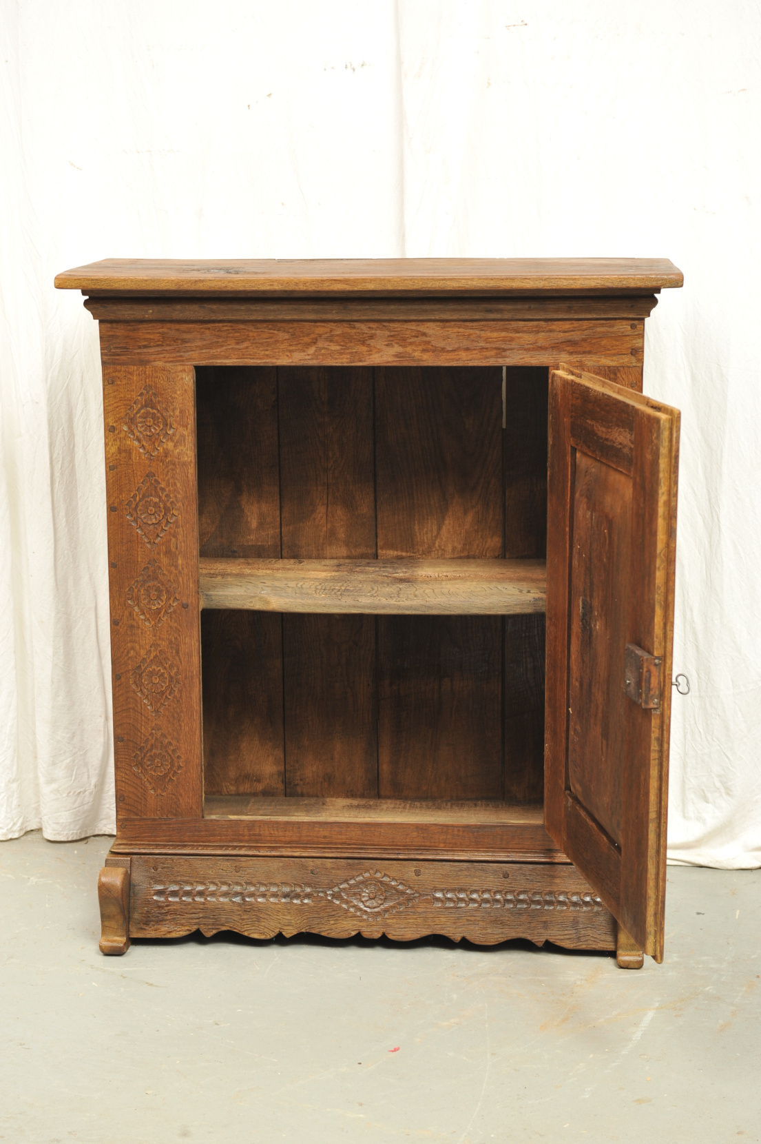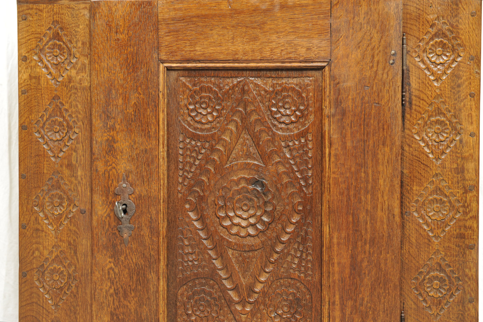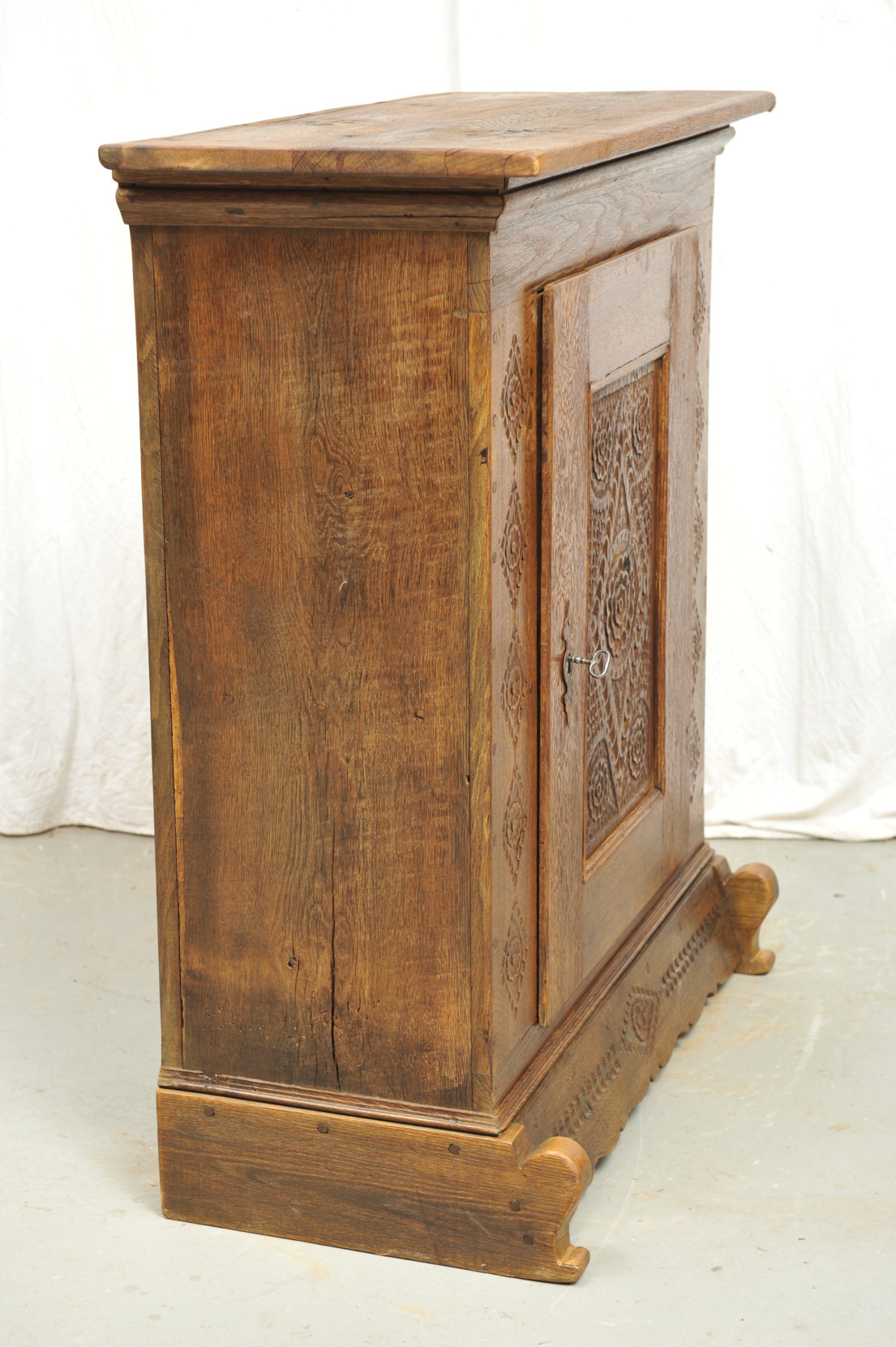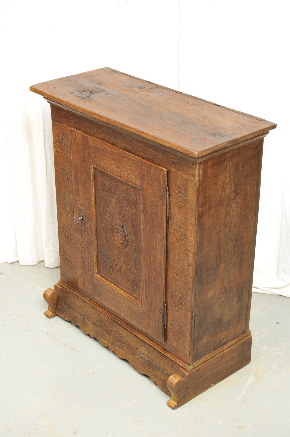 Brotschrank Eiche antik aus der Region Osnabrück, eintürig, auf Kufen stehend mit reicher Schnitzarbeit: Schuppen in Rosetten- und Rautenform auf den Lisenen , den Rahmen und der Türfüllung zieren die Front. Dunkle rustikale Eiche, kompakt und schwer und mit einem gesuchten Format: B 103 H 118 T 50