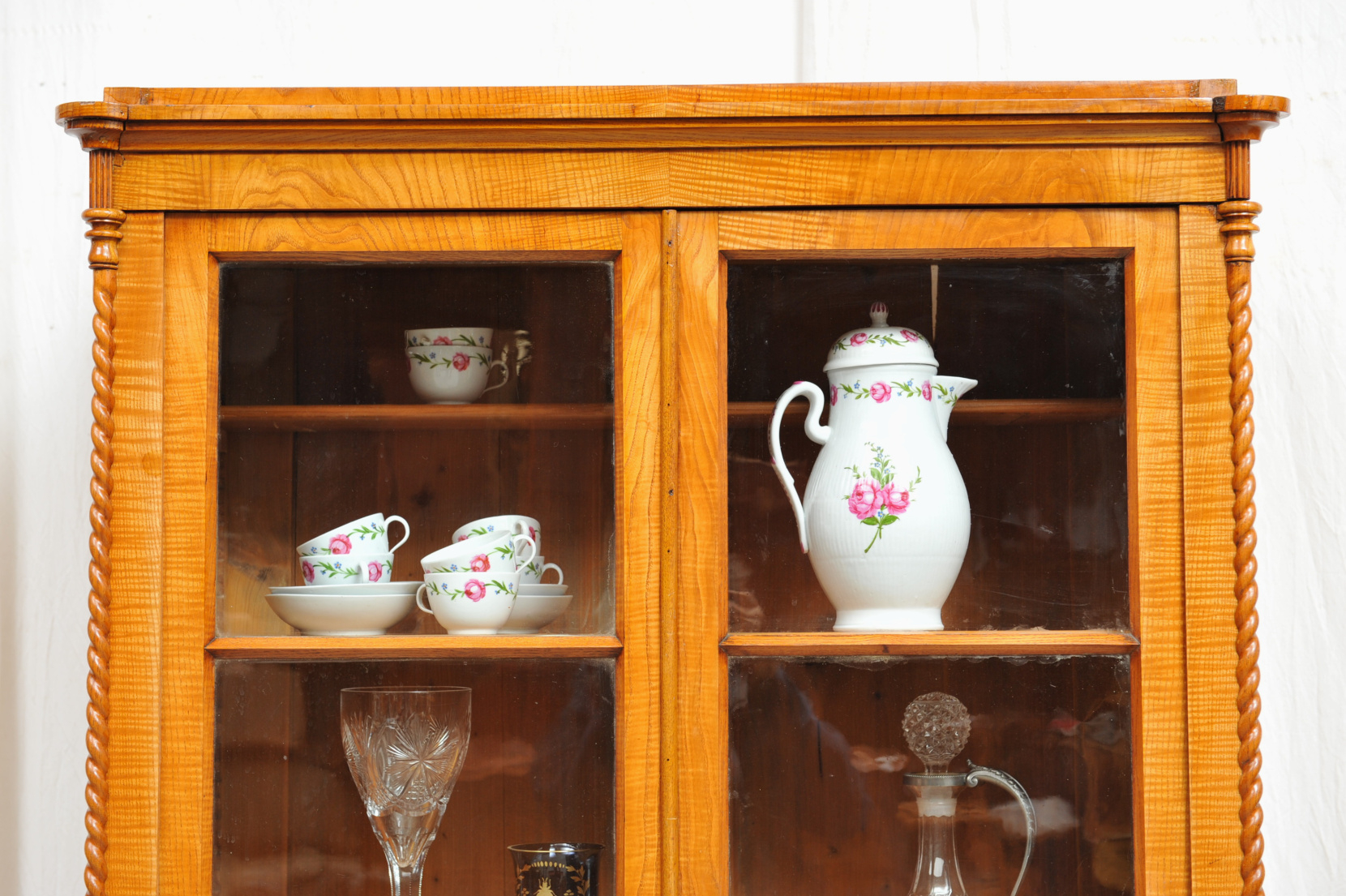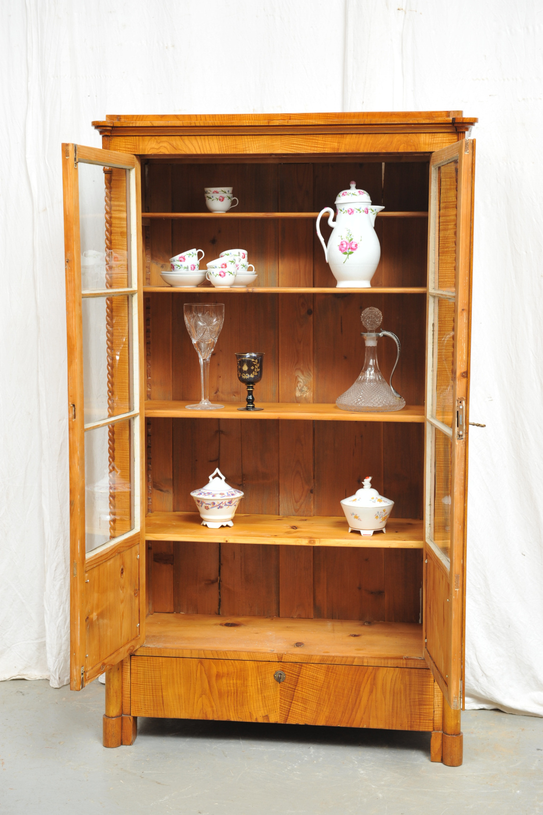 Bücherschrank Biedermeier Esche gefertigt um 1830 in Norddeutschland. Der Schrank besitzt eine Sockelschublade und darüber zwei Fenstertüren mit Holzfüllung im unteren Viertel. Attraktiv und schön ist das vertikal strömende Furnierbild von Schubladenfront und Türfüllungen. Das Eschenfurnier wurde mit Schellack und kirschbaumfarbenen Porenfüller grundiert und weist nach der Restaurierung und Polierung eine authentische Patina auf. Die gedrechselten „Korkenziehersäulen“ sind seitlich der Lisenen eingestellt und sind ebenfalls regional typisch für diesen eleganten, zierlich erscheinenden Biedermeier-Schrank. Diese Schränke dienten als Ausstellungsraum um Gegenstände wie Porzellan oder Bücher stilvoll und sicher zu präsentieren.