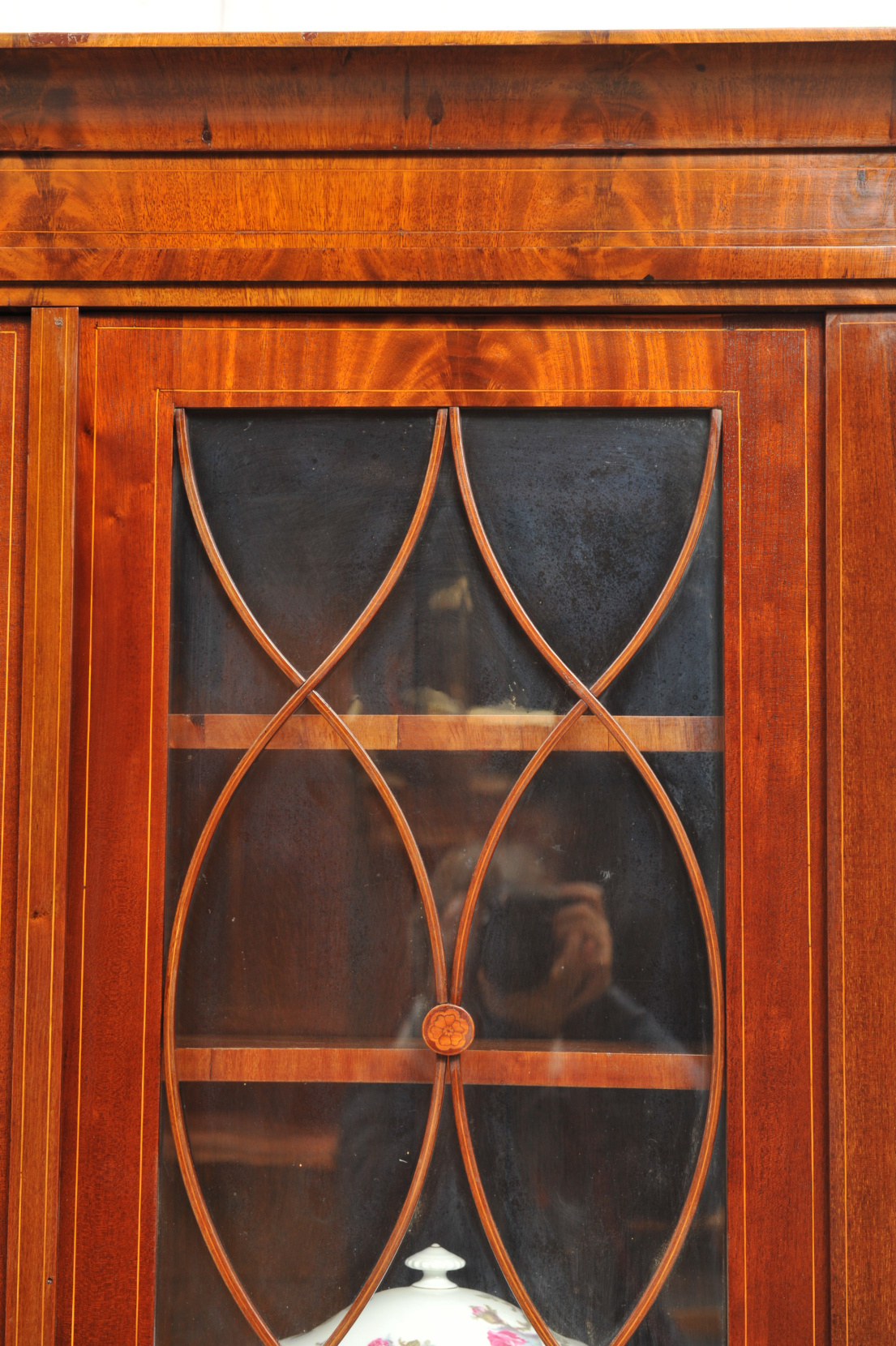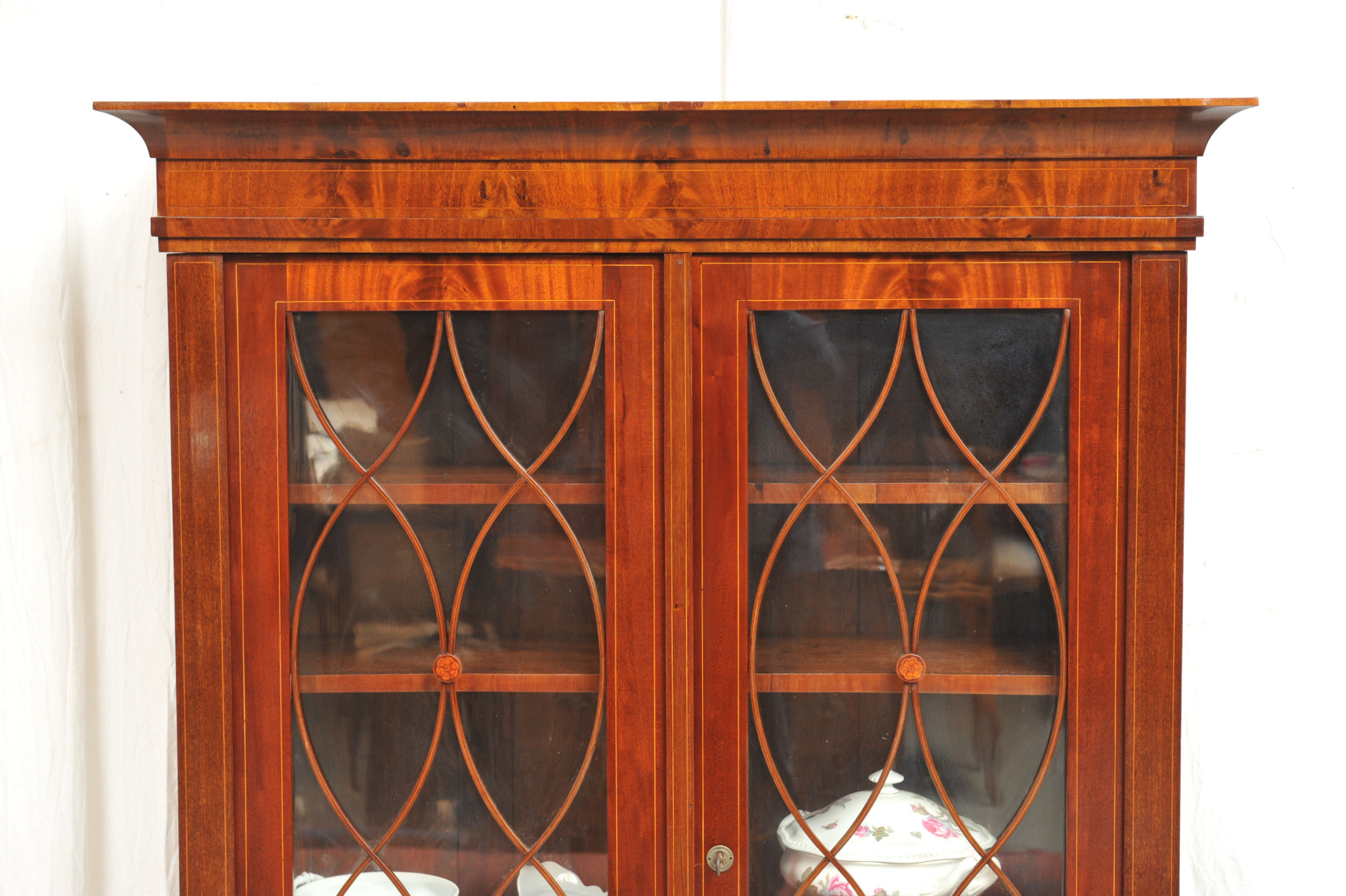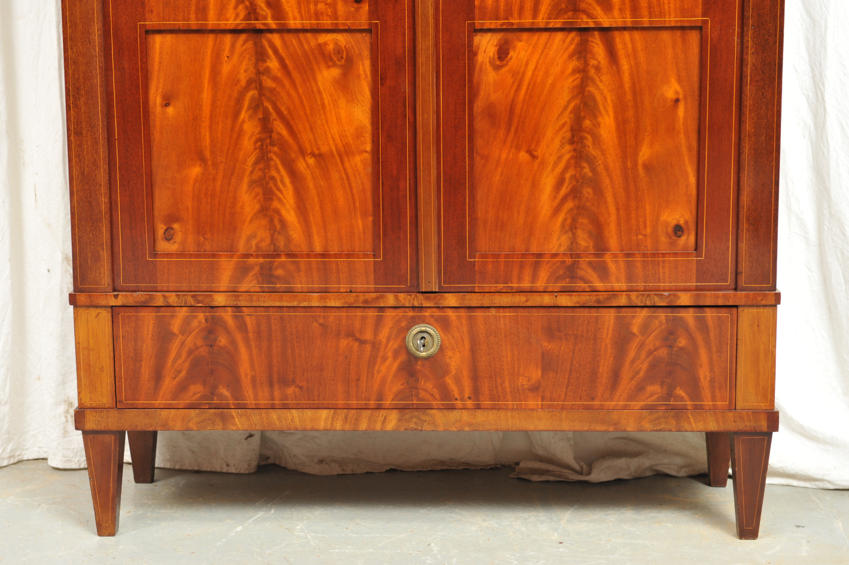 Bücherschrank Biedermeier Mahagoni , mit feinen Ahorn Fadeneinlagen, norddeutsches oder Berliner Biedermeier um 1820 . Dass das Mahagoni-Furnier auf Eiche (statt des häufigeren Weichholzes) aufgebracht wurde, spricht für eine besonders hochwertige und stabile Bauweise. Eiche als Trägerholz wurde oft bei repräsentativen Stücken verwendet, um ein Verziehen des Möbels über Jahrzehnte zu verhindern. Fadeneinlagen aus Ahorn: Diese filigranen, hellen Kontrastlinien (auch „Ahornadern“ genannt) sind ein klassisches Merkmal des Biedermeier. Sie betonen die architektonische Gliederung des Schranks und bilden einen edlen Kontrast zum dunklen, oft pyramidenförmig gespiegelten Mahagoni. Die ellipsenförmigen Versprossungen der Glastüren sind ebenfalls mit solchen Fadeneinlagen und einer Schellack-Handpolitur veredelt, was dem Schrank seine Leichtigkeit verleiht. Die vier originalen Fachböden mit furnierter Vorderkante sind ein bedeutendes Qualitätsmerkmal für dieses Biedermeier-Möbel Bei einfacheren Stücken blieben diese Kanten oft roh oder wurden lediglich gebeizt. Die durchgehende Furnierung sorgt bei geöffneten Türen für ein harmonisches und hochwertiges Gesamtbild. Die Kombination aus Eiche-Blindholz und Mahagoni-Furnier an den Kanten deutet auf eine Fertigung hin, bei der keine Materialkosten gespart wurden. Besonders beeindruckend ist die gespiegelte Maserung (Pyramiden-Mahagoni) in den unteren Türfüllungen und auf der Schublade, die eine lebendige, symmetrische Optik erzeugt. Altes originales Fensterglas. Ein Bücherschrank der Extraklasse aus der Biedermeierzeit!