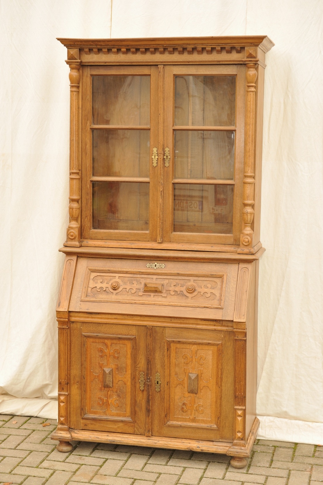 Ein Spitzensekretär aus der Gründerzeit um 1880, erbaut aus massiver Eiche. Die reliefierten Rechtecksfüllungen mit mittigen „Diamantierungen“ der Türen und der Klappe, die flankierenden Säulen, das kräftige Gesims mit Zahnschnittleiste… sind die herausragenden Charakteristika dieses im Bereich Osnabrück/Herford erbauten Eichensekretärs.