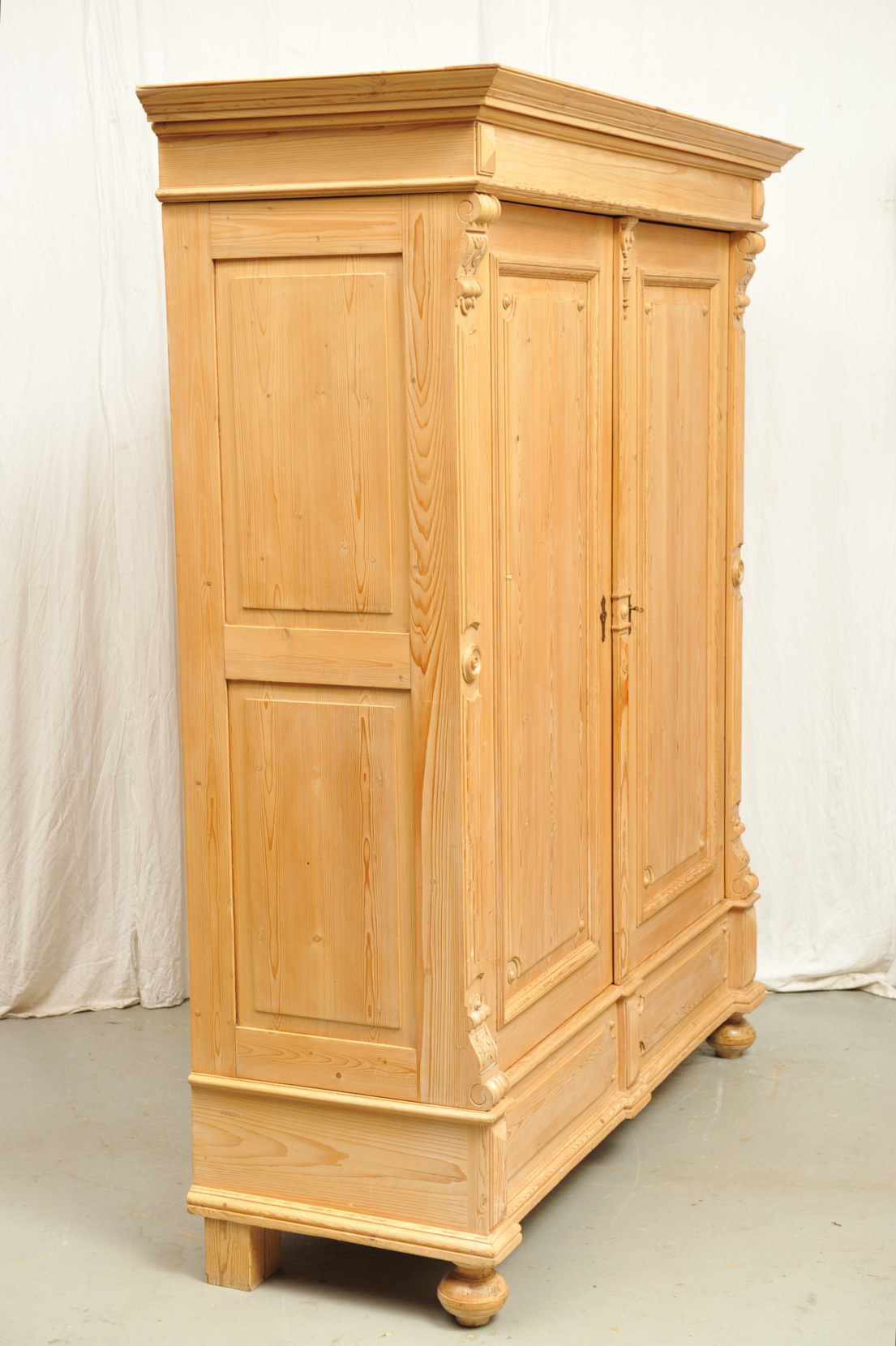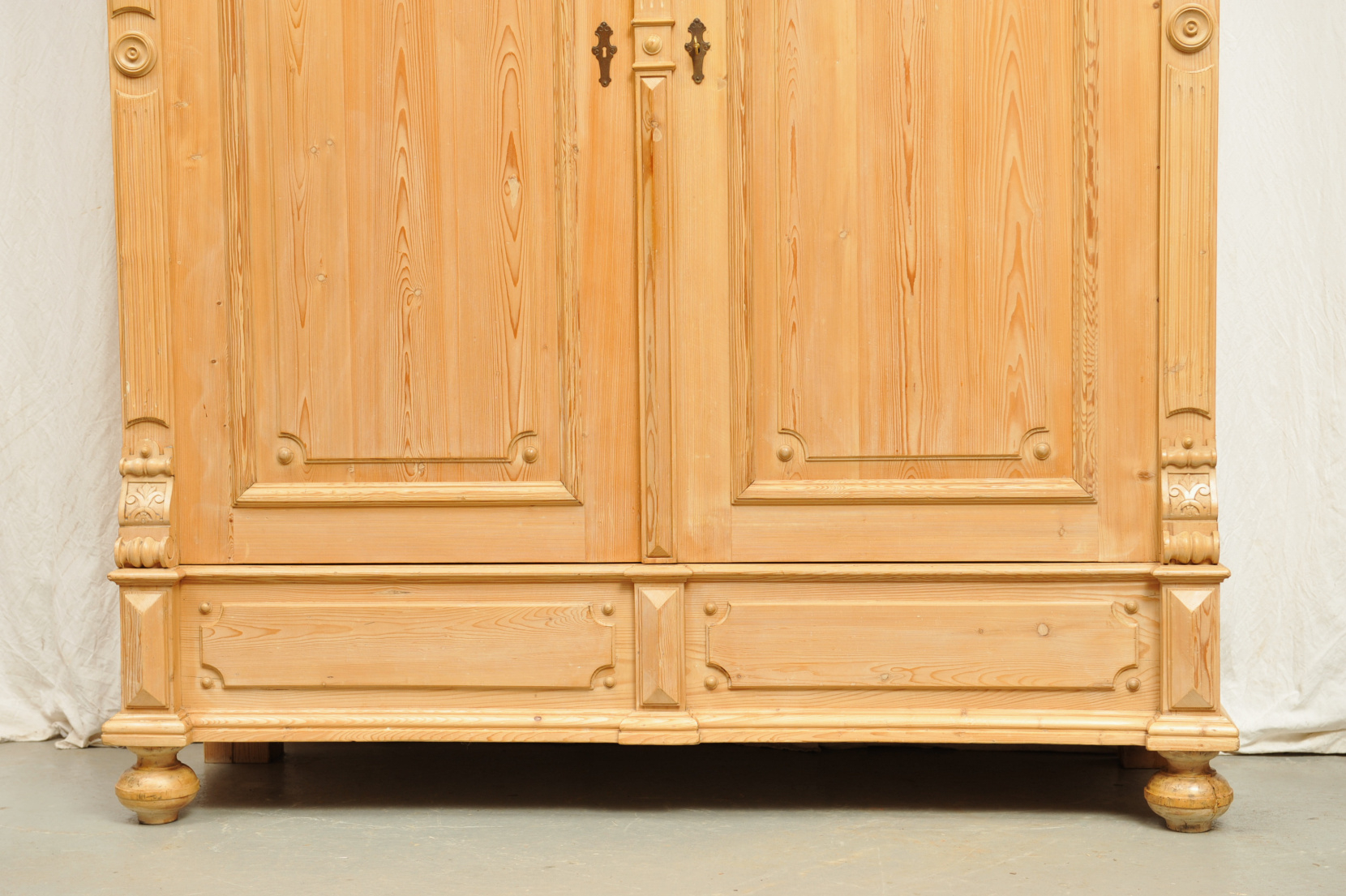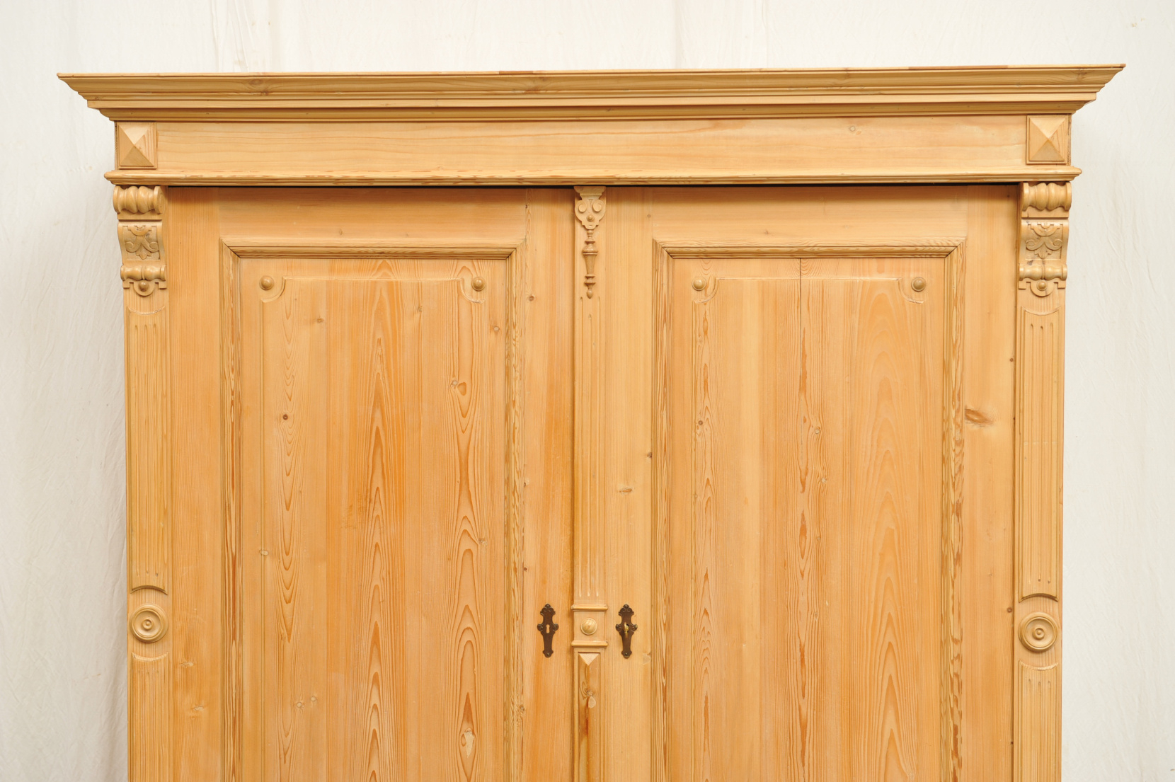 großer Gründerzeit Dielenschrank Weichholz mit üppiger Bügeltiefe. Ein zerlegbarer Kleiderschrank/ Garderobenschrank mit tollen Proportionen und in hervorragendem Zustand. Der Schrank ist mit allen zeittypischen Stilelementen/ Verzierungen ausgetattet, besticht jedoch durch seine Geradlinigkeit und Symetrie in der Erscheinung. Eine vorhandene Inneneinrichtung mit ein Drittel Wäschefächer auf der linken Schrankseite kann rechts durch zwei übereinander angeordnete Kleiderstangen oder eine Ablage plus Kleiderstang für Mäntel ergänzt werden. Selten schöner heller Farbton, schöne gleichmäßige Maserung, aus einem Baum gebaut.