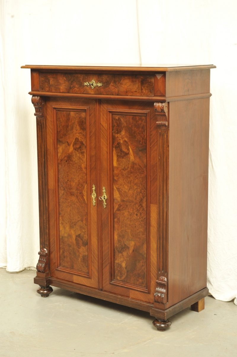 klassisches Gründerzeit Vertiko Nussbaum und Nusswurzel furniert,…ohne Aufsatz. Dieser schlanke, pfeilerartige und „dreiviertelhohe“ Schrank besitzt zwei Türen, eine Kopfschublade und eine vorkragende und an den Rändern profilierte Deckplatte. Die Türfüllungen und die Schubladenfront wurden mit schönem marmorartig gemasertem Nusswurzelfurnier gestaltet. Kannelierte Pilaster mit fein geschnitzten Schnecken (Kapitelle) flankieren die Türen mit den profilierten Füllungsrahmen. Die originalen Messingbeschläge sind noch vorhanden.