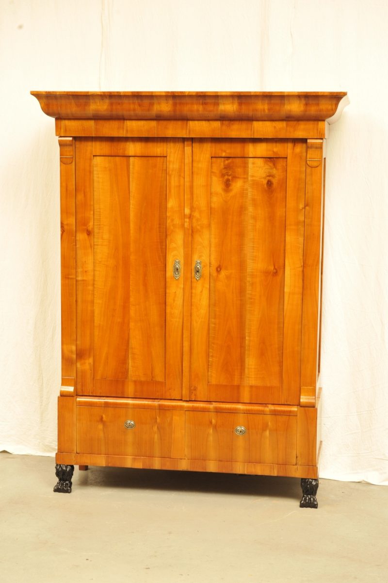 prächtiger klassizistischer Dielenschrank Kirsche furniert, Rheinland, erstes Viertel 19. Jahrhundert. Ebonisierte Tatzenfüße, Lisenen mit aufgelegten geschwungenen Pilaster und das stark vorkragende aufrecht furnierte Kranzprofil sind regionaltypische Stilelemente des frühen klassizistischen Biedermeierstils. Die beiden Schubladenfronten , die Türen und die Seitenteile mit je einem Füllungsbrett sind biedermeierlich schlicht gestaltet. Die aufrecht „strömende“ Furnierung prägt die schlanke, hohe Erscheinung des Möbels. Die Füße sind original, können aber ( sie stören so manchen Kunden) problemlos durch stiltypisch vertretbare Vierkantfüße ersetzt werden. Der Schrank wurde restauriert und mit Schellack grundpoliert. Der Innenausbau und die Endpolierung ( Grad des Hochglanzes) erfolgt nach Absprache mit dem Kunden/ Interessenten.