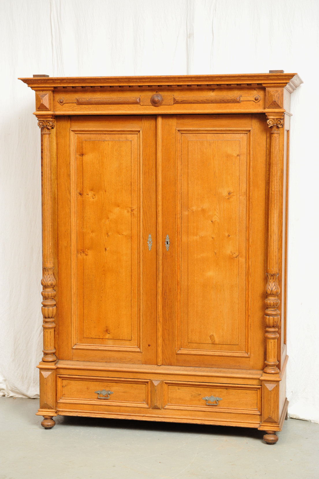 Toller Kleiderschrank Gründerzeit Eiche, ein zerlegbarer zweitüriger Schrank mit zwei Schubladen. Ein Original von 1880. Proportionen: super! Zustand: super! …freundlicher heller Farbton.