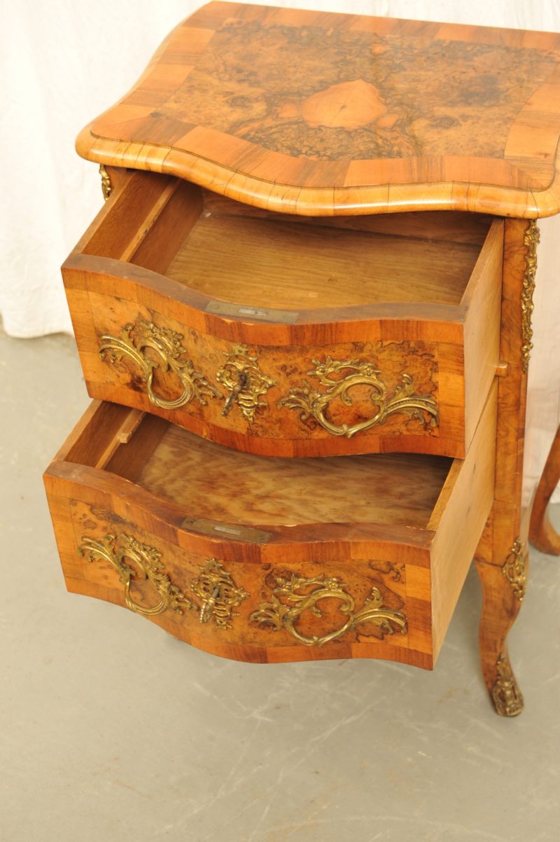 Kleine Kommode im Dresdener Barock-Stil erbaut um 1880/90. Front und Platte der zweischübigen Kommode sind mittig gebaucht. Nusswurzel- und Nussbaumfurnier sind stiltypisch gefeldert marketiert. Reiche Messingapplikationen auf Schubladen, Lisenen, Sockelzarge und den vorderen S-förmigen Beinen sind ein Hauptmerkmal des Dresdener Barock-Stils, der aufgrund des technischen Fortschrittes kostengünstige und vielfältige Kopien des Sachsen-Rokoko von 1760 fertigen konnte.