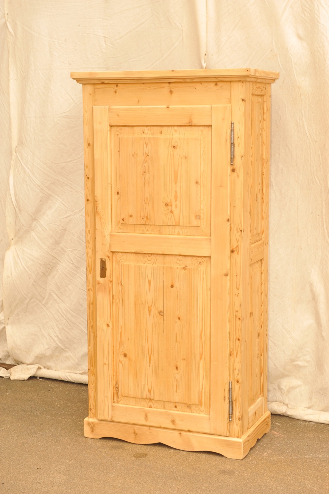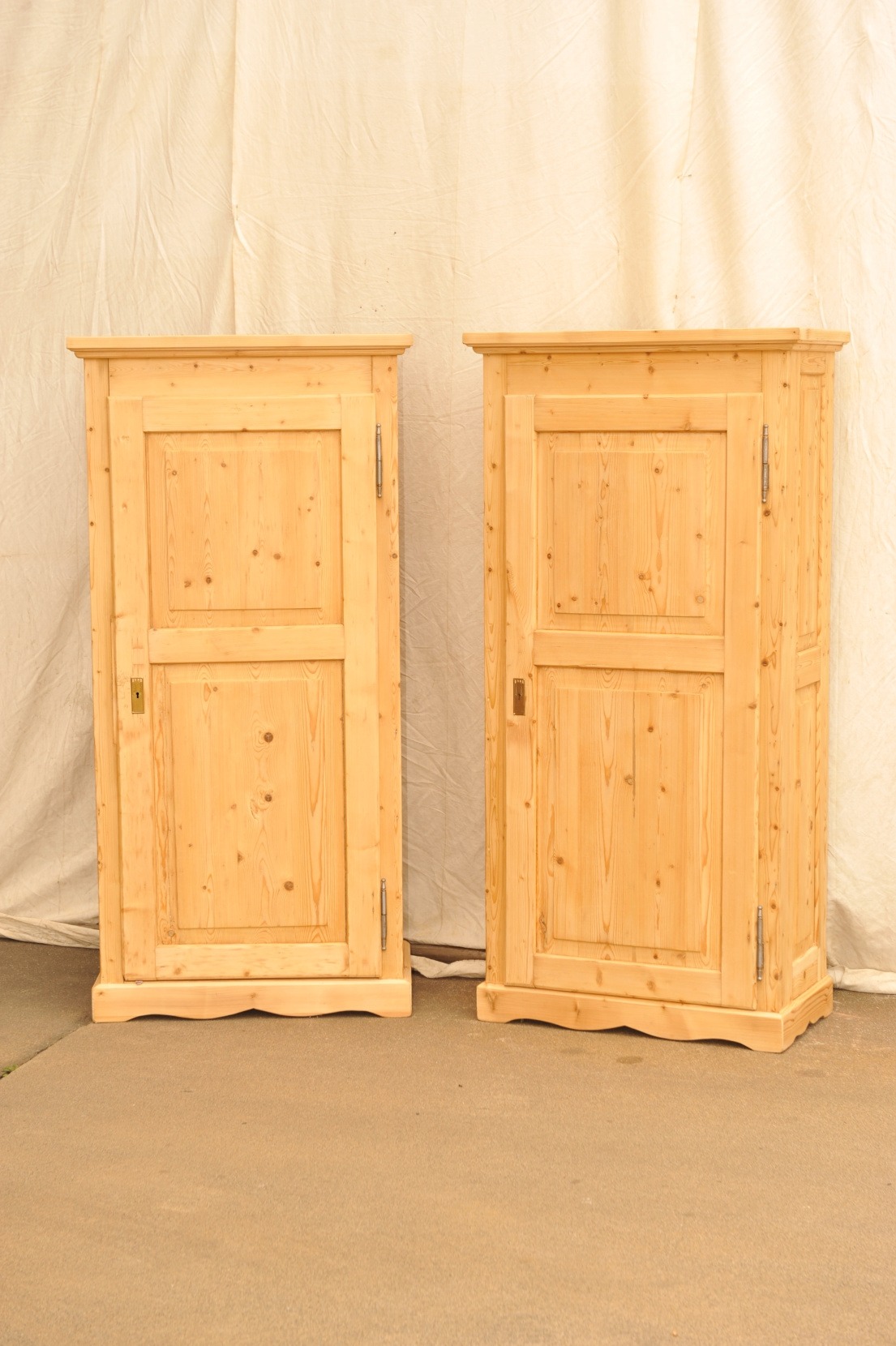 Paar antiker eintüriger Schränke, Biedermeier Weichholz. Die komplett aufschwingende Tür und die Seitenteile erbaut jeweils mit Doppelkassette im Rahmen und Füllungsbau. Originale gesägte Fußzarge. Die pfeilerartigen Schränke mit der geringen Breite erhalten einen Innenausbau nach Wunsch. Einzelpreis: 1050,00 Euro