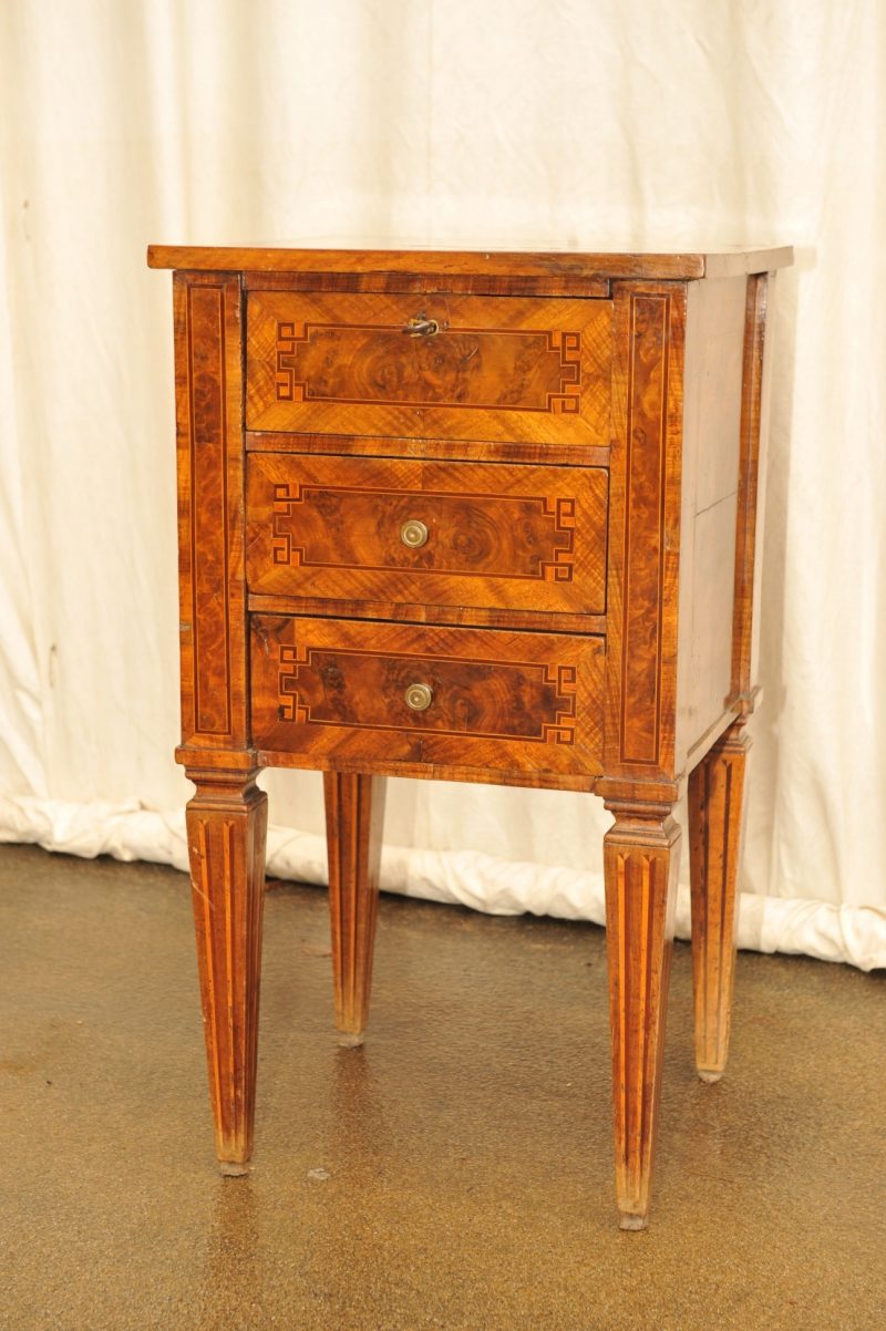 Kleine Pfeilerkommode Louis XVI. Allseitige Rahmen- und Füllungs Marketerien aus Nussbaum und Nusswurzel mit mäandernden Einfassungsintarsien aus Ahorn und Pflaume gestalten Platte, Schubladenfronten sowie Seiten und Rückwand (!). Der rechteckige Korpus mit pilasterartig vorgezogenen Lisenen wird getragen von vier sich konisch verjüngenden Spitzbeinen. Die obere Schublade ist mit dem Original Schnappschloss abschließbar, eine mechanische Zentralverriegelung verschließt die unteren Schübe. Ein seltenes, museales, hoch attraktives Kleinmöbel von 1770. Die originalen „Messingschuhe“ fehlen. Weitere Aufbereitungen des Möbels sind nach Absprache möglich, leicht „verblichene“ Oberflächen werden „aufgefrischt“
