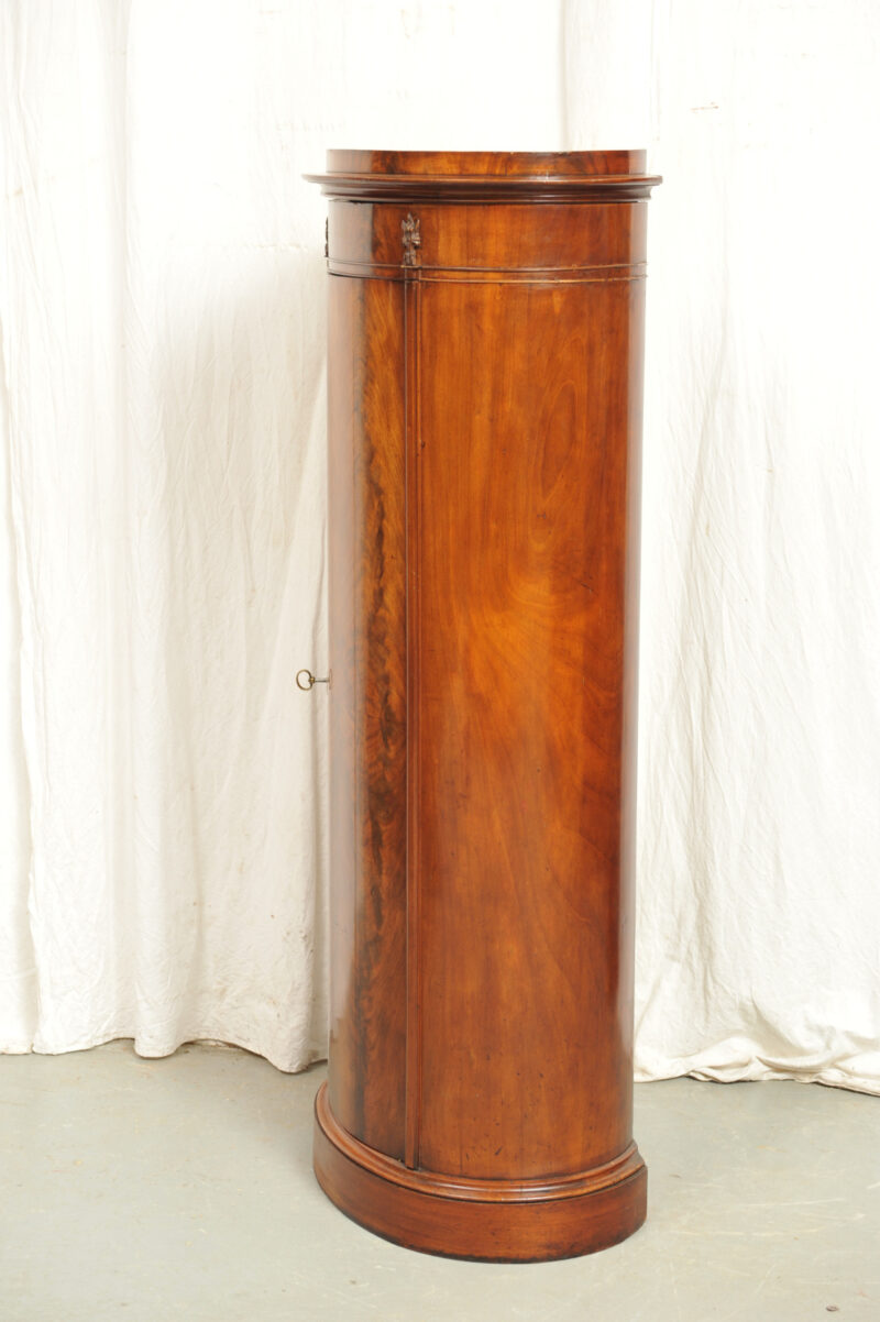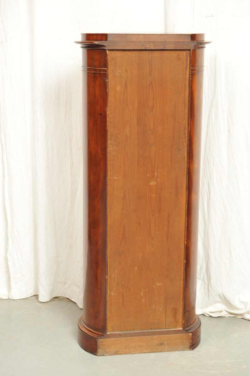 Dieser Pfeilerschrank Biedermeier wurde mit Mahagoni Pyramidenfurnier furniert. Der hohe und schlanke Korpus hat im Sichtbereich eine rundovale Form ( “Möbeldesign” um 1830/40). Es war eine exklusive Möbelform für Silberschränke, Postamentschränke,…. in norddeutschen/ dänischen Biedermeierhaushalten . Der Schrank ist sehr gut erhalten und “erstrahlt” nun mit einer erneuerten Schellack Handpolierung wieder im alten Glanz.