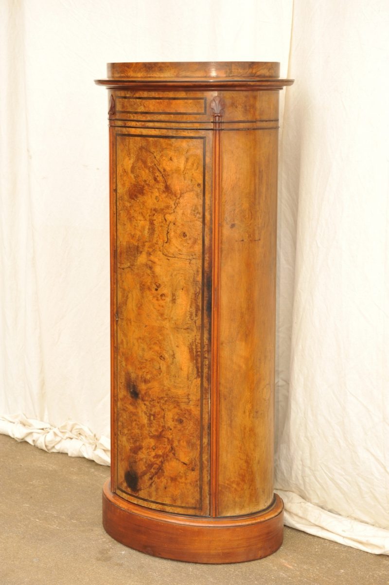 Biedermeier Pfeilerschrank Nussbaum furniert,stilisierte Pilaster flankieren die mit ebonisiertem Band optisch gerahmte Tür, süddeutsch 1820. Dies ist in mehrfacher Hinsicht ein sehr seltenes außergewöhnliches Salonmöbel mit einer extravaganten Form: bombierter Korpus mit einer Tür, dreiviertel ovale Form, schlank und rank (H 145). Damit ist er ein ideales Podest für den Zierat des biedermeierlichen Wohnzimmers wie Büsten, Vasen, Skulpturen… im optimalen Blickfeld. In der Literatur finden sich viele Namen für ein rares Format: Pfeilerschränkchen, Silberschränkchen, Vasenschrank, Postamentschrank, Trommelschrank….Preis „aufgefrischt“ : 2400; von Grund auf restauriert und handpoliert: 2900 Euro
