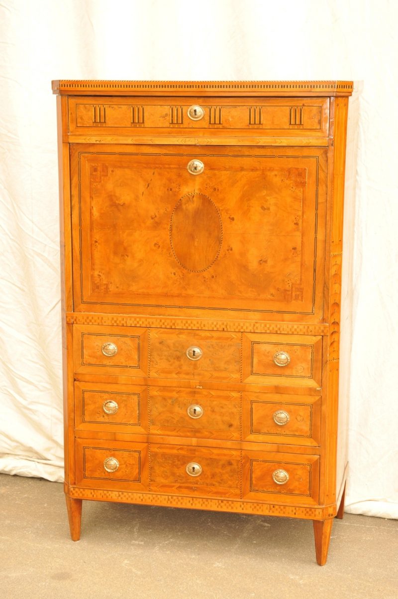 Schreibschrank Louis XVI, ein toller Sekretär von 1790 aus der Berner Werkstatt des Ebenisten Christoph Hopfengärtner. Ein Möbel mit einem geraden strengen Aufbau: dreischübiges Kommodenteil, darüber Schreibklappe und Kopfschublade. Die seitlichen Lisenen in leichtem Winkel nach hinten abgeschrägt, entsprechend die Deckplatte und das Fußgesims gestaltet. Konisch nach unten sich leicht verjüngende Vierkantbeine. Feinste und kompliziert gestaltete Marketerien verschiedenster Edelhölzer in Komposition mit ruhigen Flächen ( Wurzelahorn) sowie das für Hopfengärtner typische Oval sind die Gestaltungselemente. „Rahmungen“ der Felder durch ( hell/dunkel) Ahorn und Ebenholz Fadeneinlagen und „gependelte“ hell/ dunkel Filetbänder bestimmen die Architektur. Originale Beschläge und Schlösser, Schlüssel fehlten.
