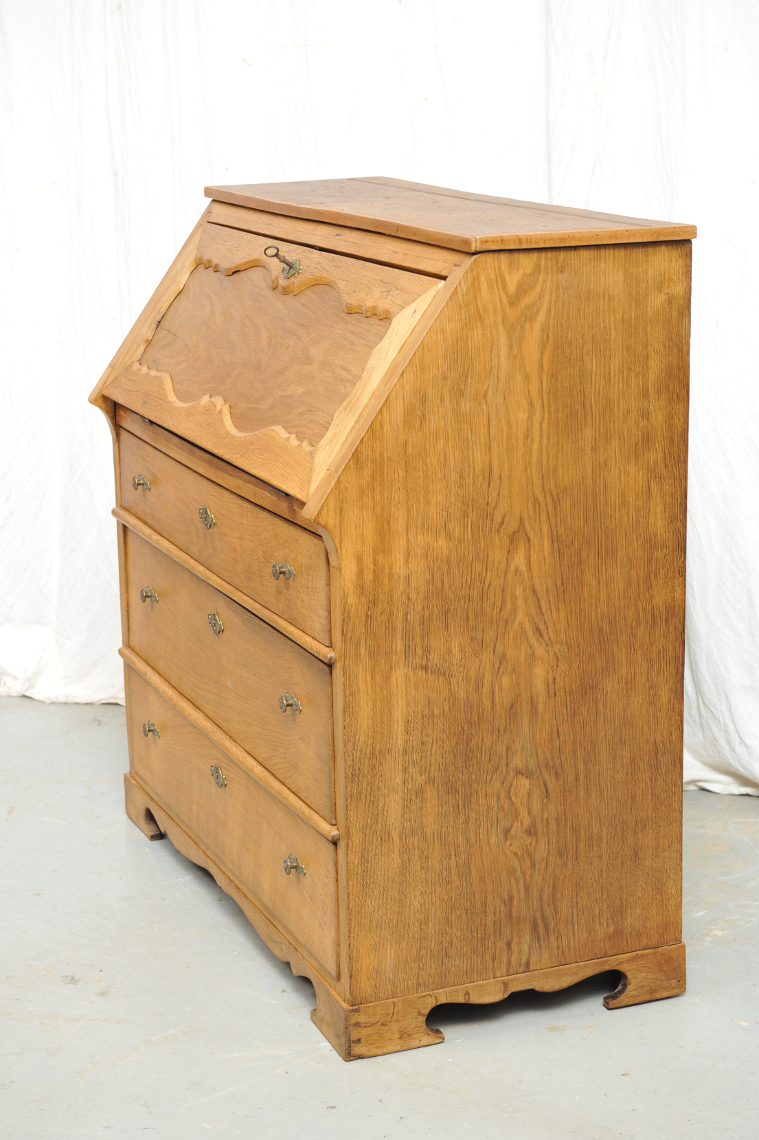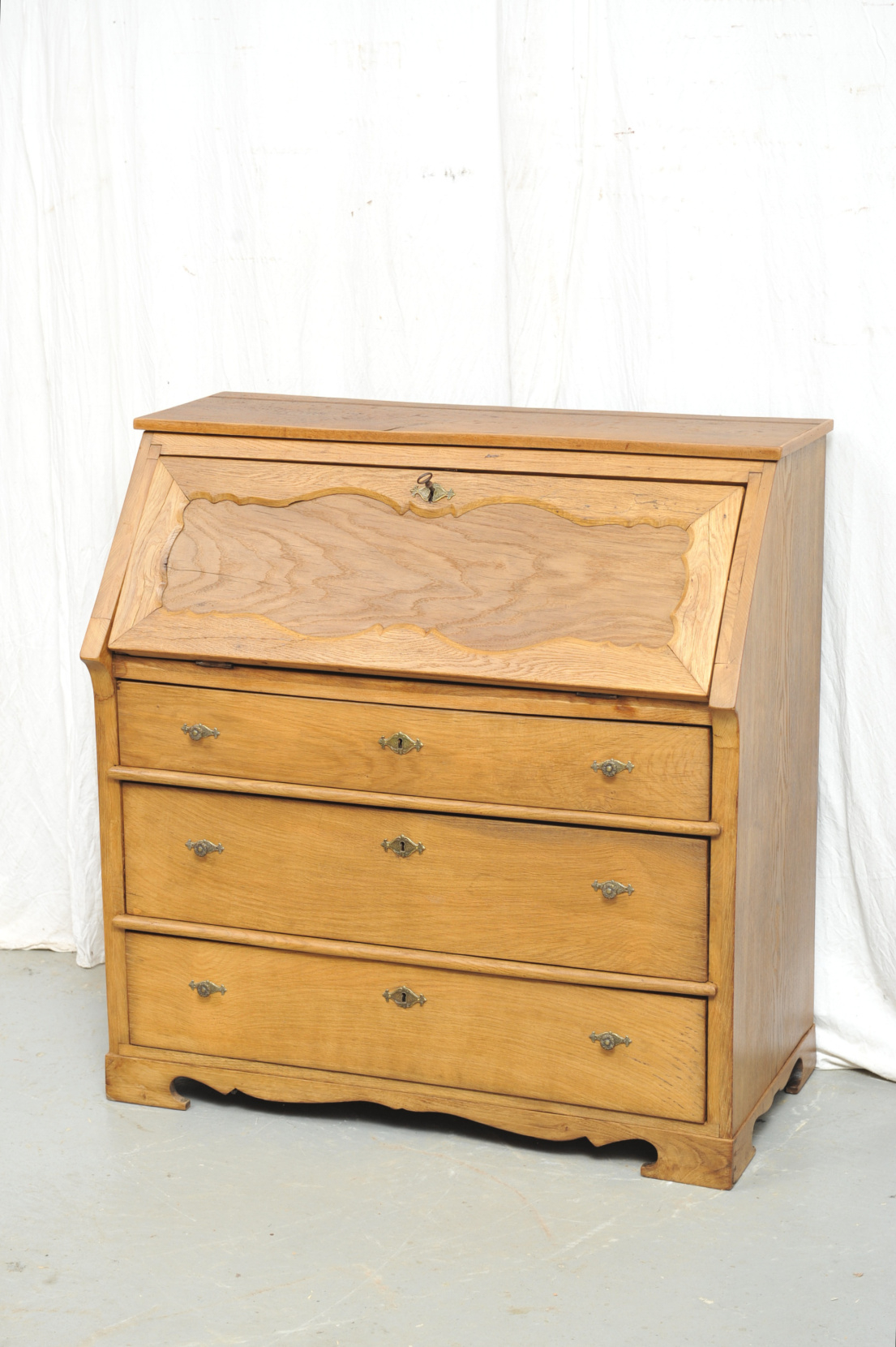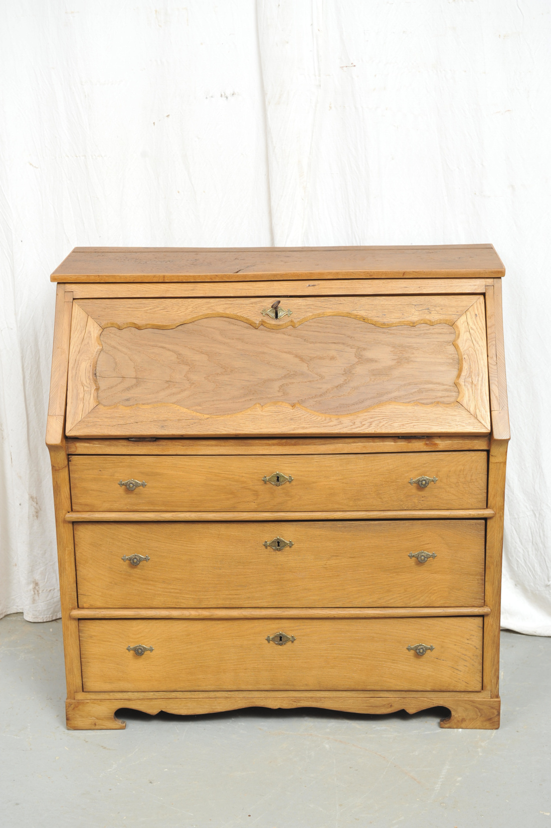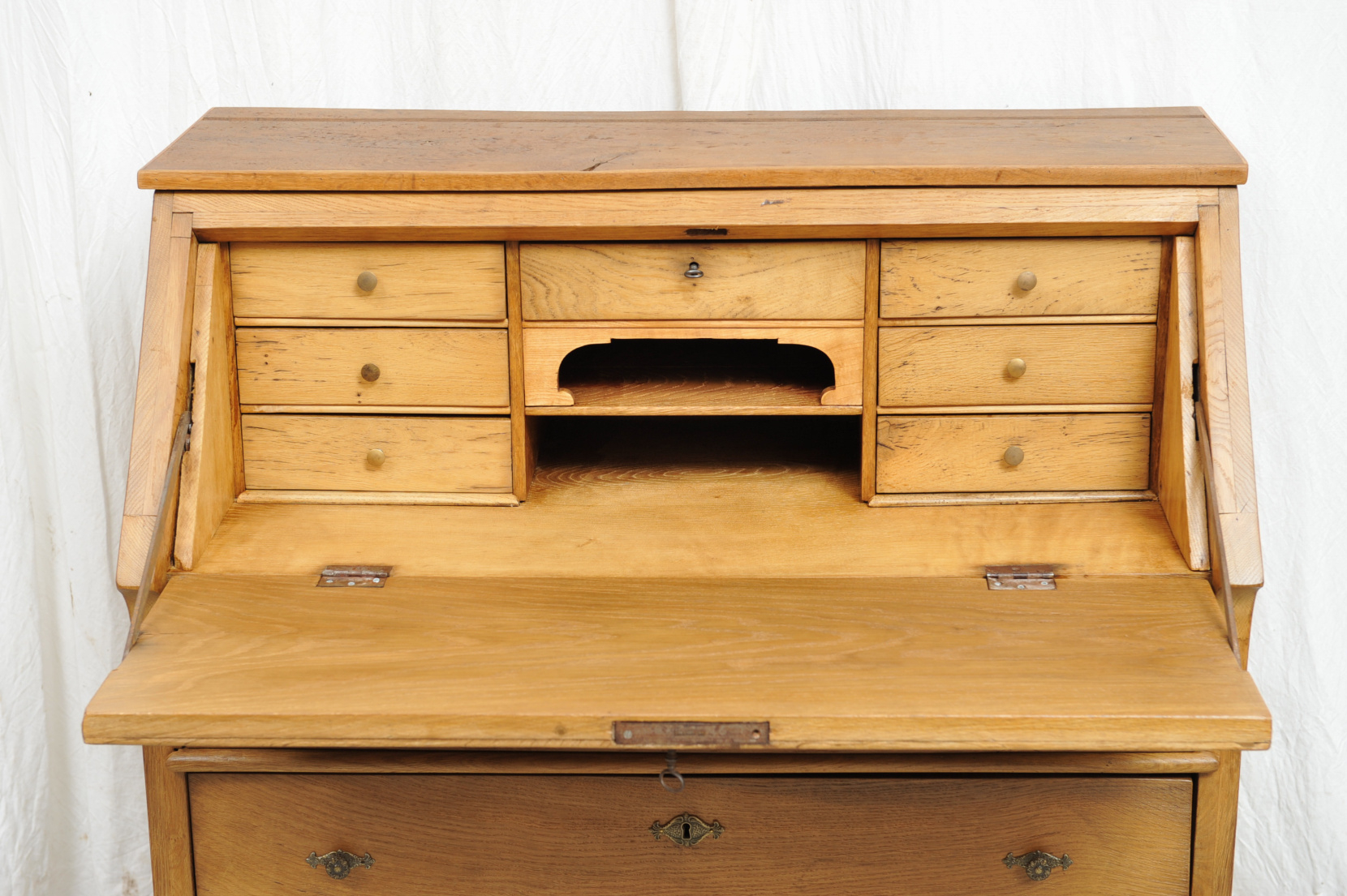 Sekretär Eiche Biedermeier, ein sogenannter Schrägklappensekretär erbaut um 1835. Das Untergeschoss auf ausgeschnittener Zarge ruhend ist eine dreischübige Kommode. Hinter der Schrägklappe, die aufgeklappt die Schreibplatte bildet, besitzt der Schreibsekretär eine Inneneinrichtung mit zwei zentralen Ablagefächern und darüber einer kleinen Schublade sowie sechs flankierenden Schubladen. Dieser sogenannte Schrägklappensekretär aus Eichenholz, ist ein Typ, der im 19. Jahrhundert populär war, die geschwunge Rahmung der Klappe weist auf ein „spätes Biedermeier“ hin .